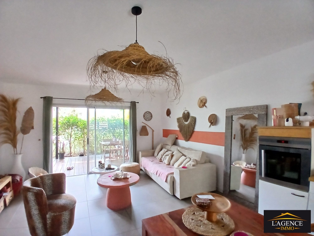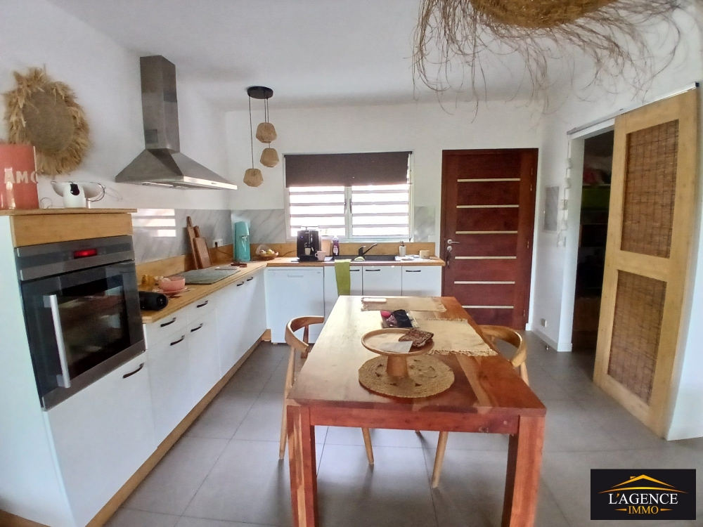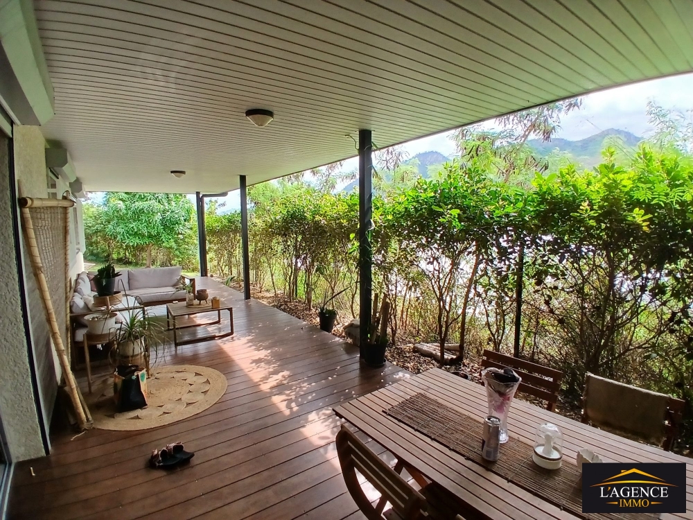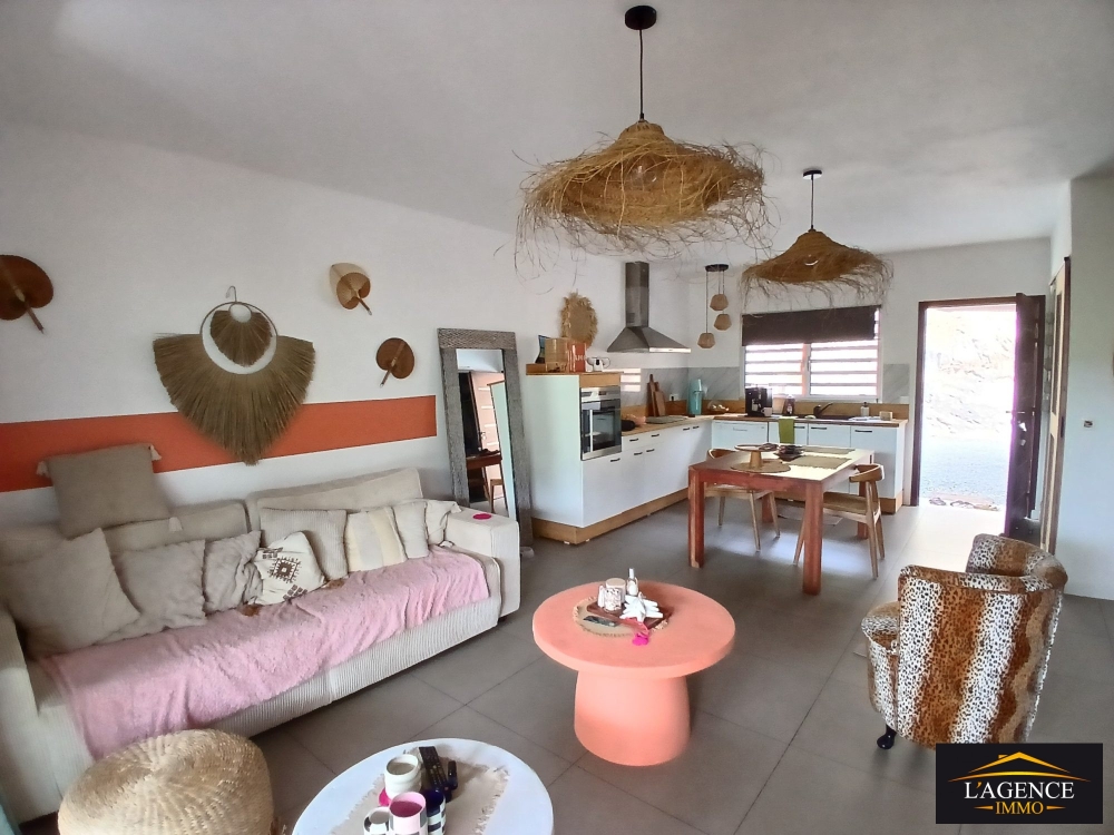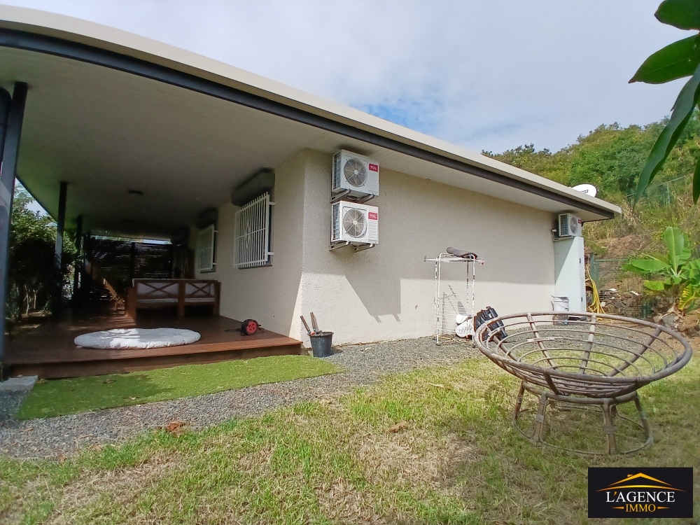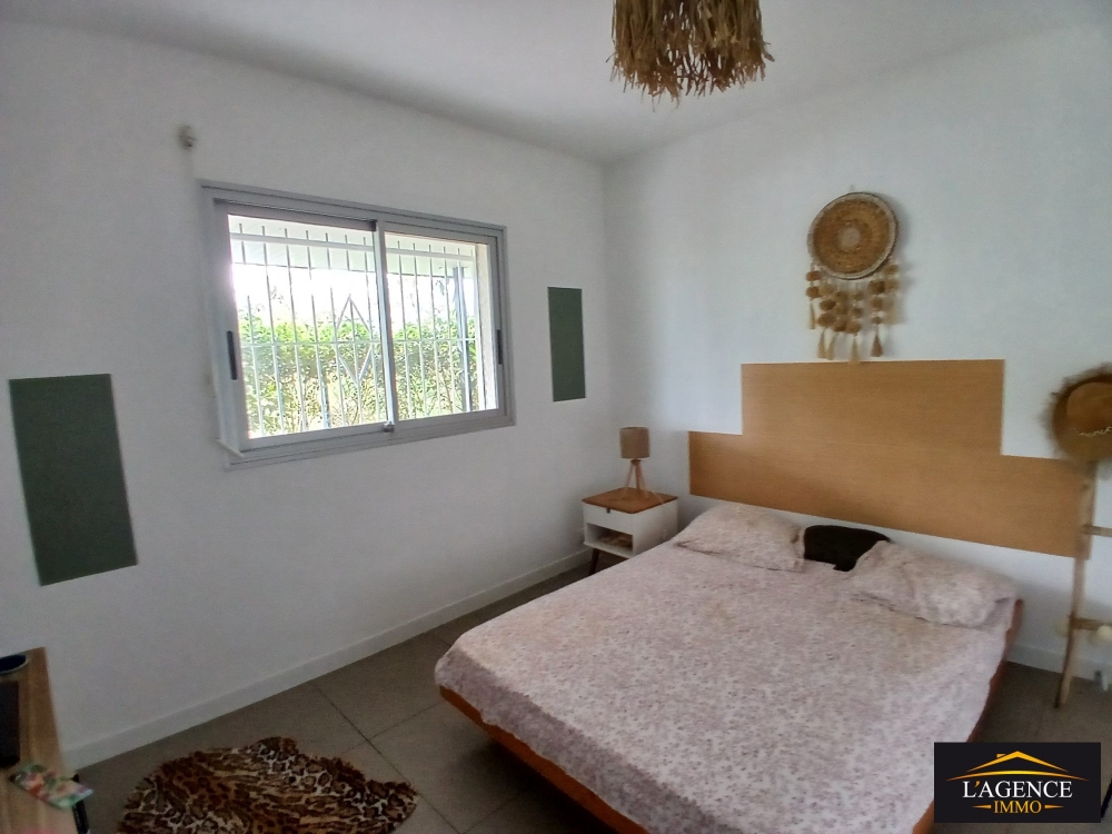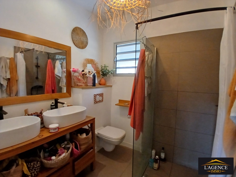 Villa F4 d'une superficie d'environ 90m² composée d'une cuisine équipée et aménagée, d'une buanderie, d'un séjour, d'un WC indépendant, d'une salle d'eau avec WC, de trois chambres climatisées avec placards, d'une grande terrasse couverte donnant sur le jardin.