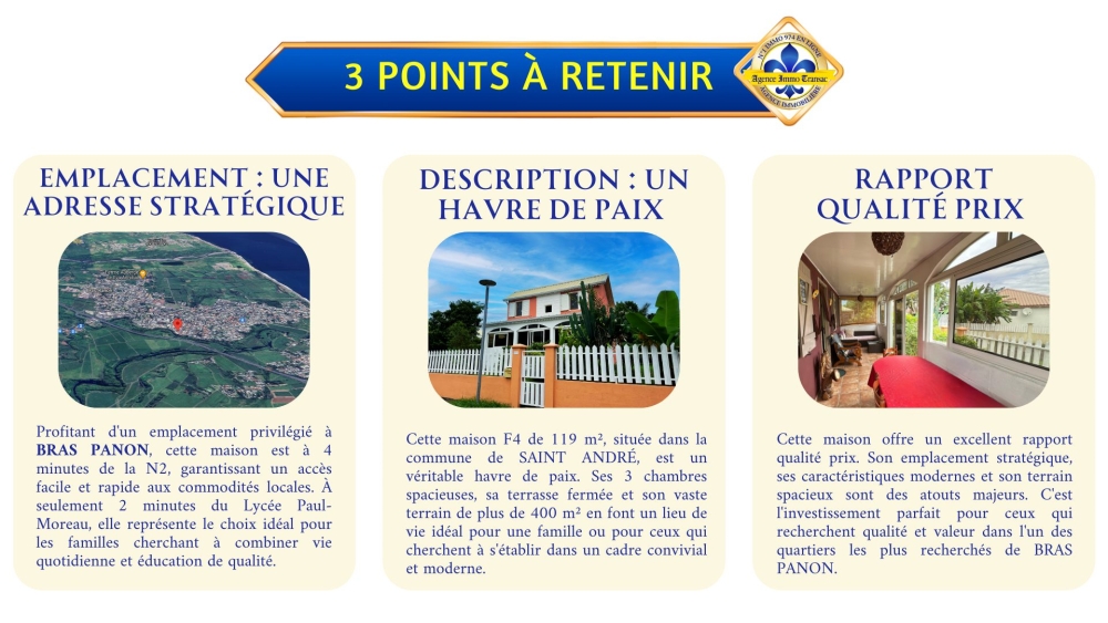 L'Agence IMMO TRANSAC REUNION vous propose de découvrir cette charmante maison F4 de 119 m², nichée sur un terrain de plus de 400 m², située à seulement 5 minutes du Leclerc BRAS-PANON.