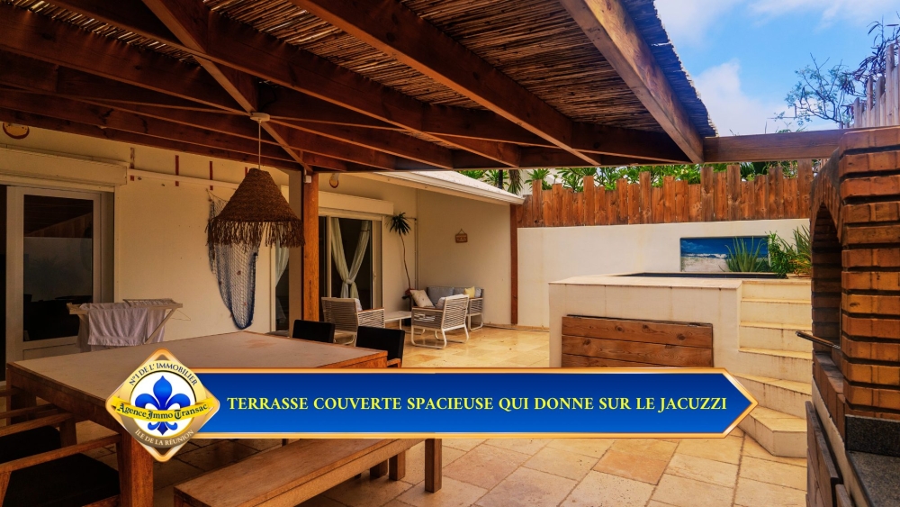 TERRASSE COUVERTE : La terrasse spacieuse est parfaite pour les repas en plein air et les moments de détente.