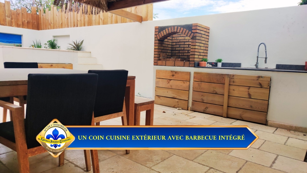 COIN CUISINE EXTÉRIEUR : Le barbecue intégré est parfait pour organiser des grillades entre amis ou en famille.