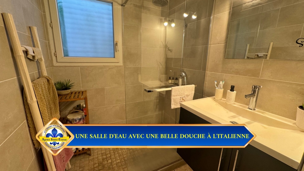 SALLE DE BAIN MODERNE : La salle de bain moderne est dotée d'une douche à l'italienne et de WC indépendants, combinant commodité et style.