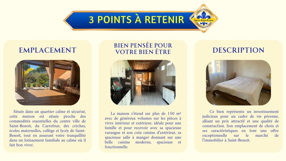 Ce bien représente un investissement judicieux, alliant prix attractif et qualité de construction. Son emplacement de choix et ses caractéristiques en font une offre exceptionnelle sur le marché immobilier de Saint-Benoît.