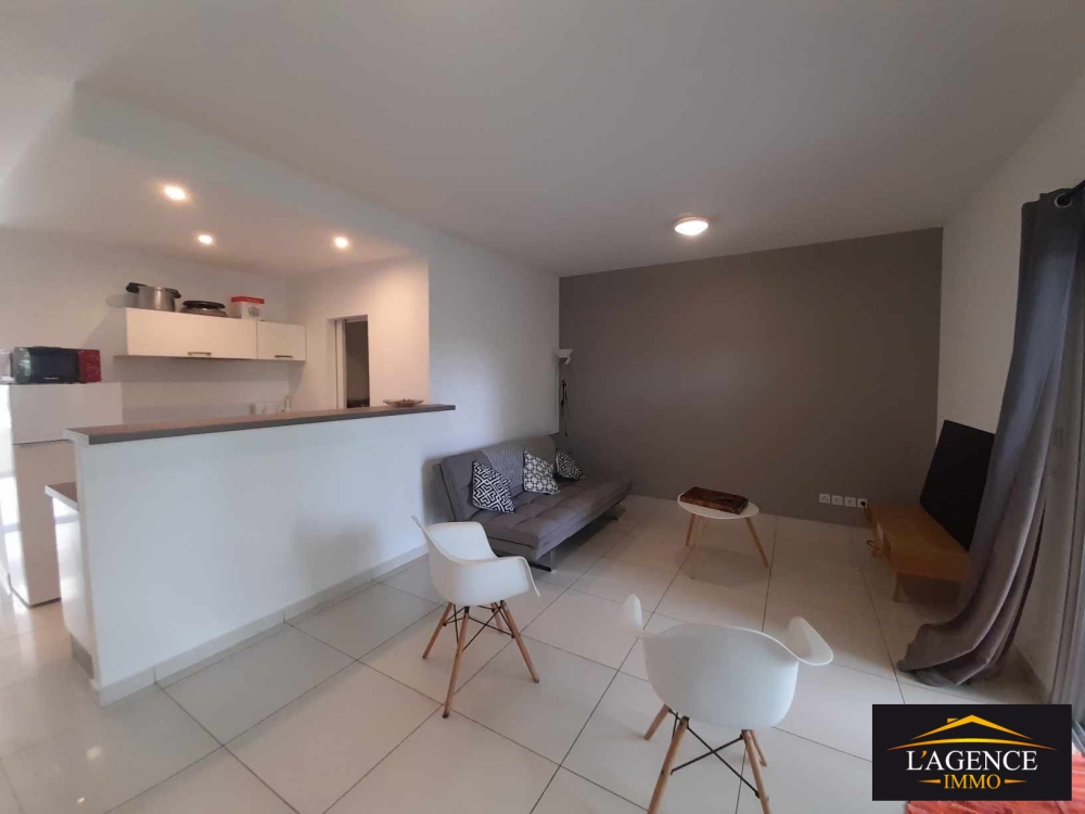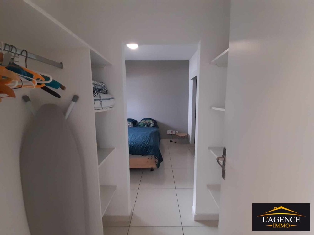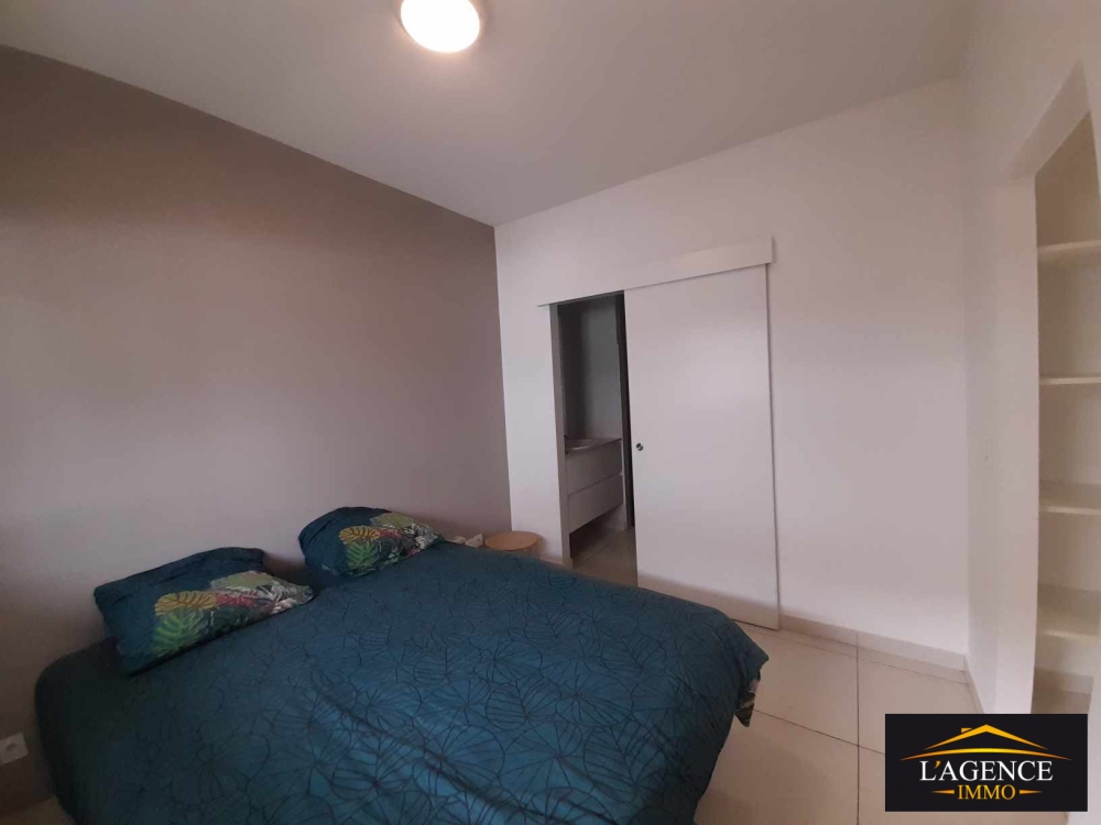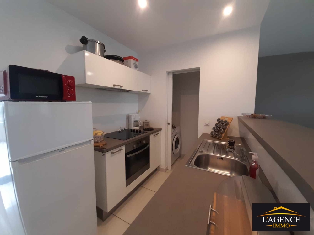 Cuisine équipée comprenant un four, une plaque et une hotte. Séjour avec volets roulants. Espace buanderie. Chambre avec dressing, climatisation et volets roulants. WC indépendant.