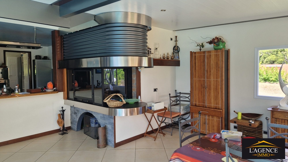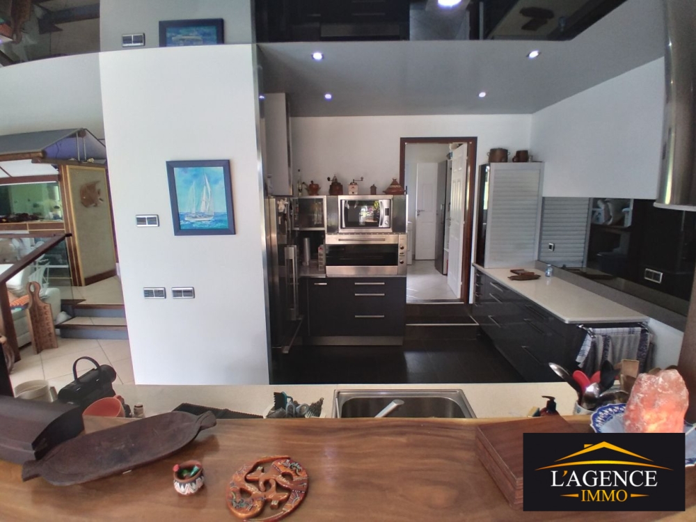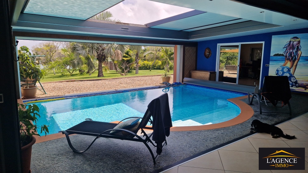 - une maison principale type F4 de 350m² habitables dont un magnifique séjour d'un volume très agréable, agrémenté d'une piscine intérieure à débordement dont le toit s'ouvre au-dessus ; une cuisine aménagée équipée avec bar, four, arrière cuisine/buanderie, une suite parentale avec dressing et salle d'eau avec douche à l'italienne, une seconde suite avec salle de bains, une vaste chambre actuellement utilisée en bureau ; deux WC, un double garage fermé carrelé, une grande terrasse, la villa principale est équipée d'un chauffe-eau solaire, d'une installation photovoltaïque, d'une pompe à chaleur pour la piscine, de volets roulants électrique et climatisation.
