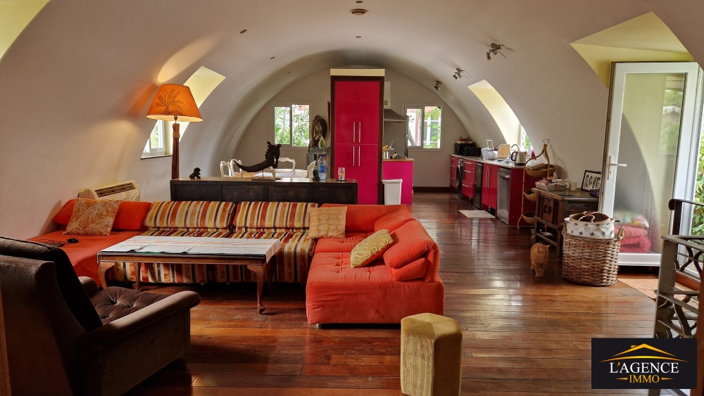 Un vaste séjour avec une cuisine aménagée et équipée.