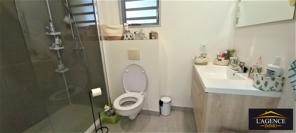 Appréciez un espace de vie lumineux, comprenant une cuisine équipée et aménagée, un séjour qui s'ouvre sur une terrasse couverte de 16m², une salle d'eau avec WC, un espace buanderie et une chambre avec des rangements intégrés et la climatisation. Deux places de stationnement sont également incluses avec cette propriété.