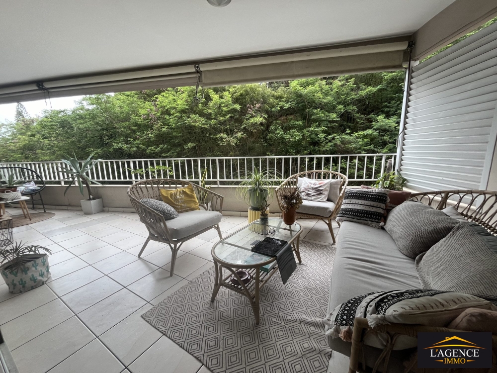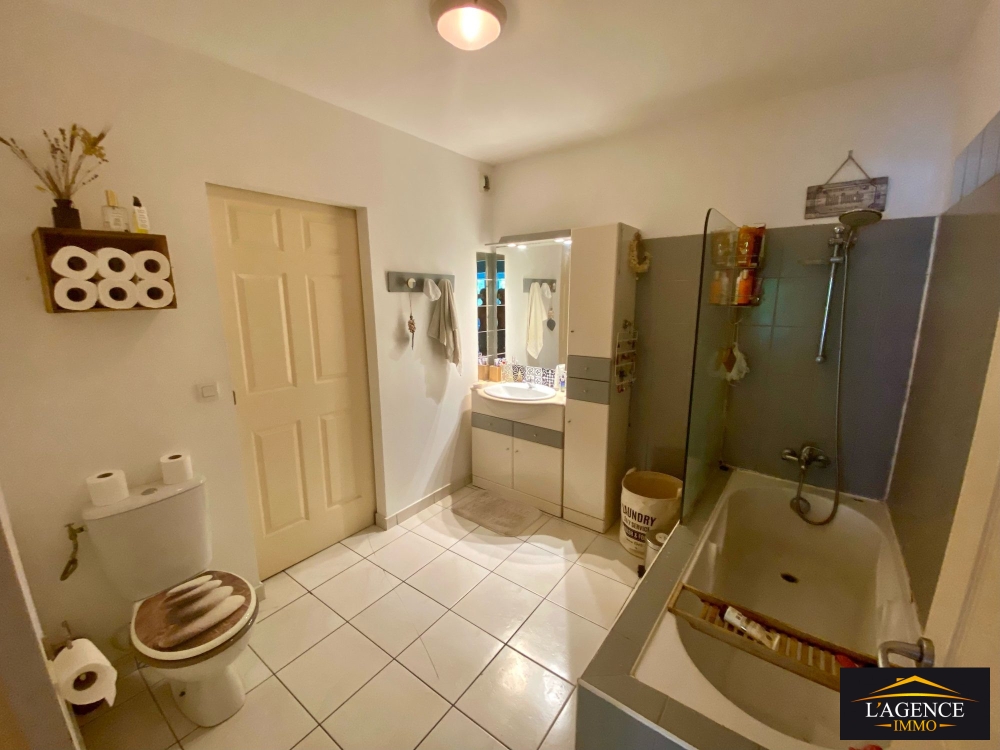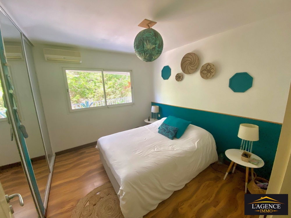 Composition : Entrée, séjour/cuisine équipée, grande chambre avec placards, salle de bains avec baignoire, WC, buanderie, un espace pouvant faire office de bureaux, terrasse couverte de 18m² offrant une vue apaisante dans un cadre végétal.