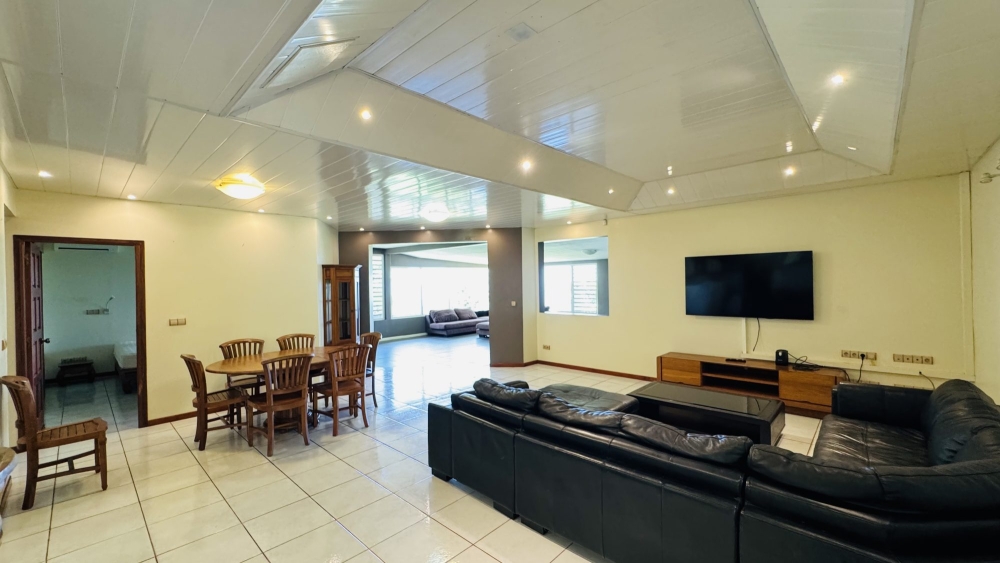 À louer : maison F4 entièrement meublée sur les hauteurs de Mahina, avec vue sur la mer et la verdure. Située sur un grand terrain plat et clôturé.