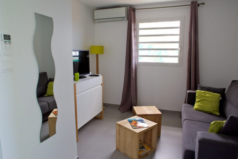 Un salon climatisé, avec TV écran plat (+ Apple TV, + wifi), et d'un canapé pouvant faire office de lit d'appoint pour 2 enfants (4 + 2, soit 6 couchages).
