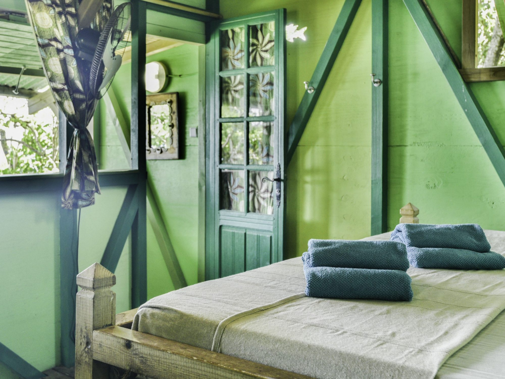 La chambre, spacieuse, avec lit en 180, est équipée d'une moustiquaire et d'un ventilateur donnant sur la salle de bains avec vue sur la mer. Vous avez la possibilité de fermer la chambre.