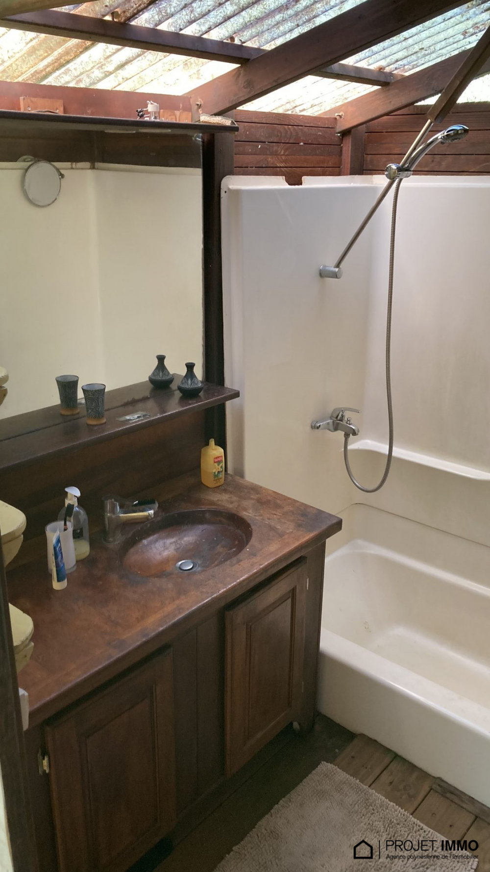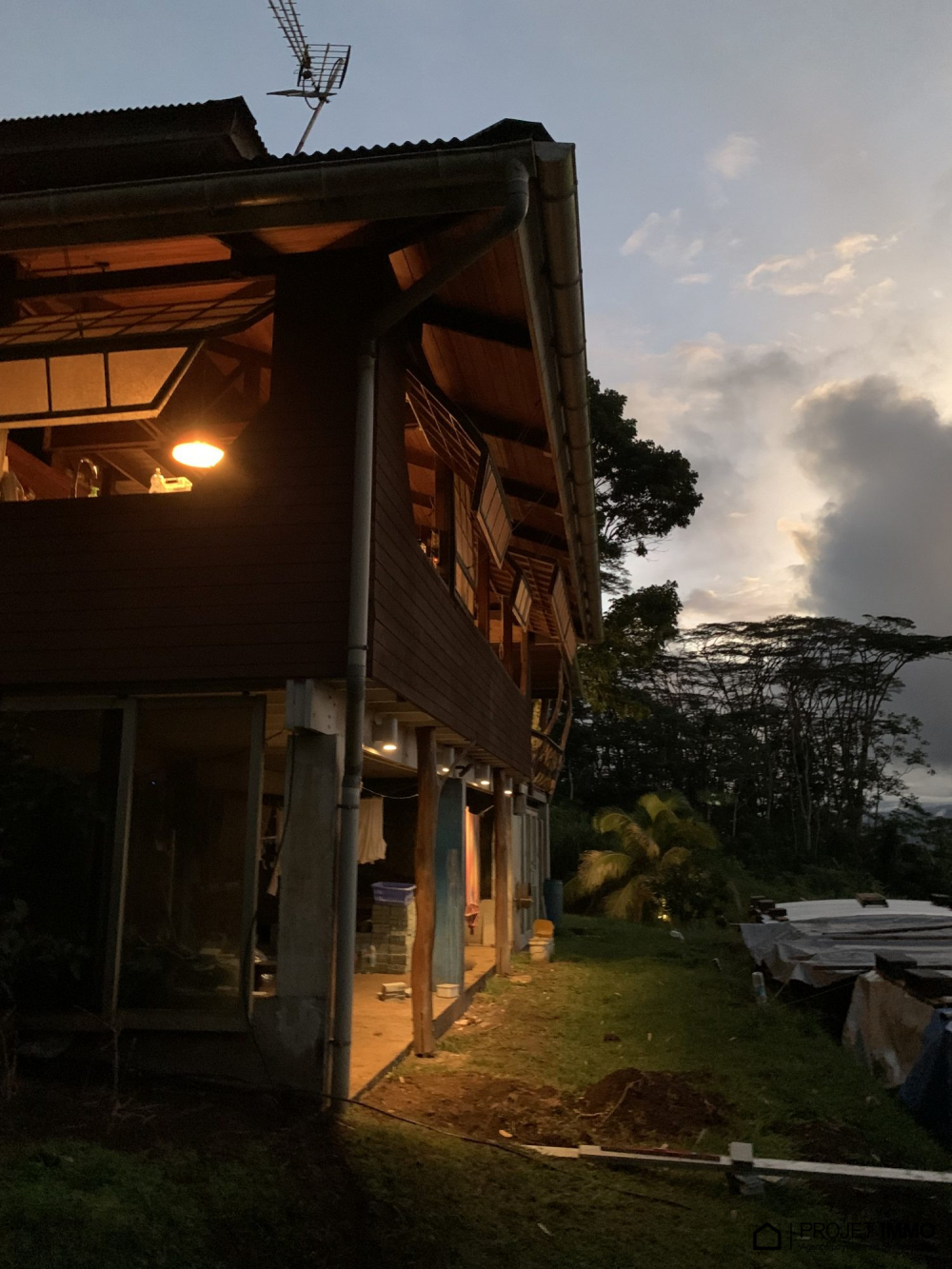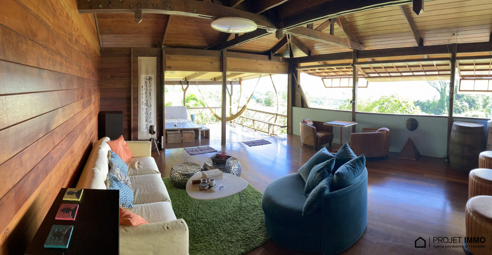 -La maison principale en bois sur pilotis compte : un couloir, 2 chambres au RDC et une chambre parentale à l'étage, cuisine-salon aménagées, 1 salle de bain + baignoire + WC indépendant avec terrasse et un atelier et buanderie au sous-pilotis.