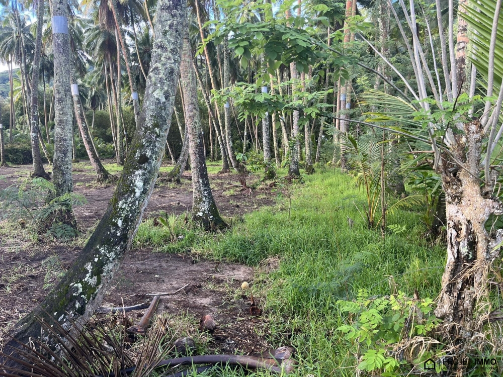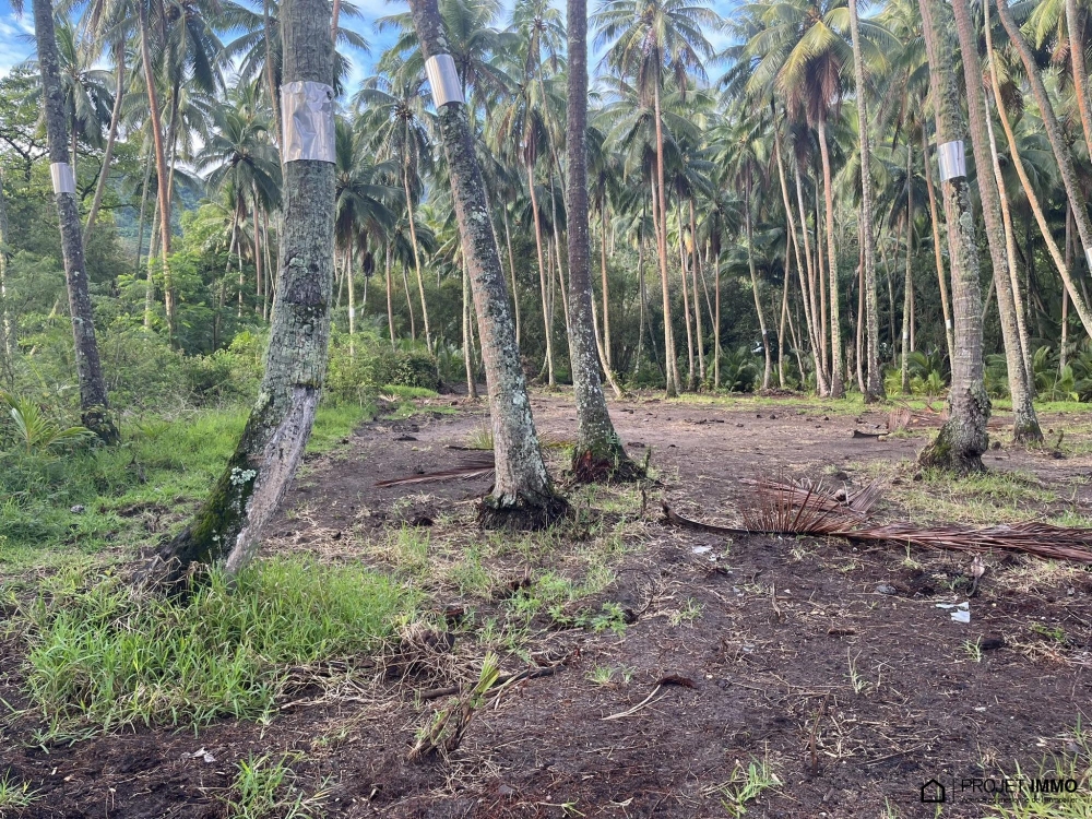 Cette parcelle de terre entièrement plate, en bord de route de ceinture, dans laquelle se trouve une végétation basse et une cocoteraie.