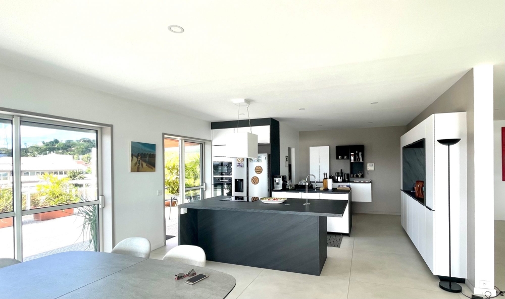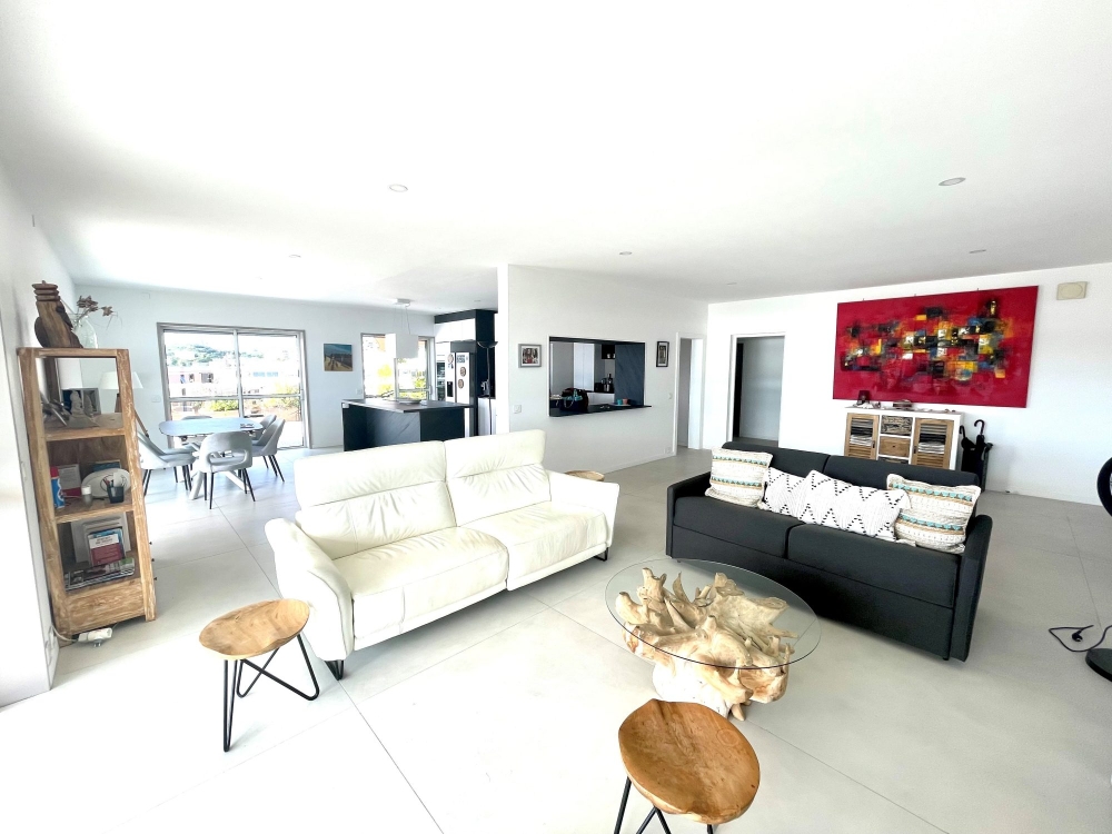 Il se compose d'un grand salon avec coin salle à manger tout en baies vitrées avec une magnifique vue mer, d'une cuisine équipée semi ouverte et d'une arrière cuisine/buanderie, d'un dégagement menant à deux chambres et une salle de bain, d'une grande suite parentale comprenant un dressing ainsi qu'une salle d'eau. Deux des chambres ont un accès direct sur la terrasse.