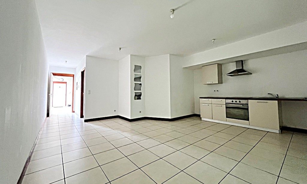 Cuisine équipée ouverte sur séjour, chambre climatisée avec placards, salle d'eau avec wc.