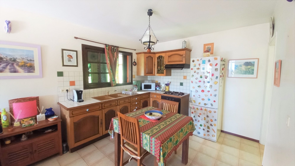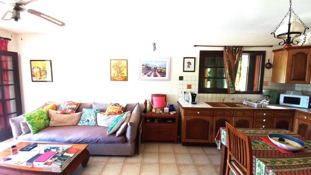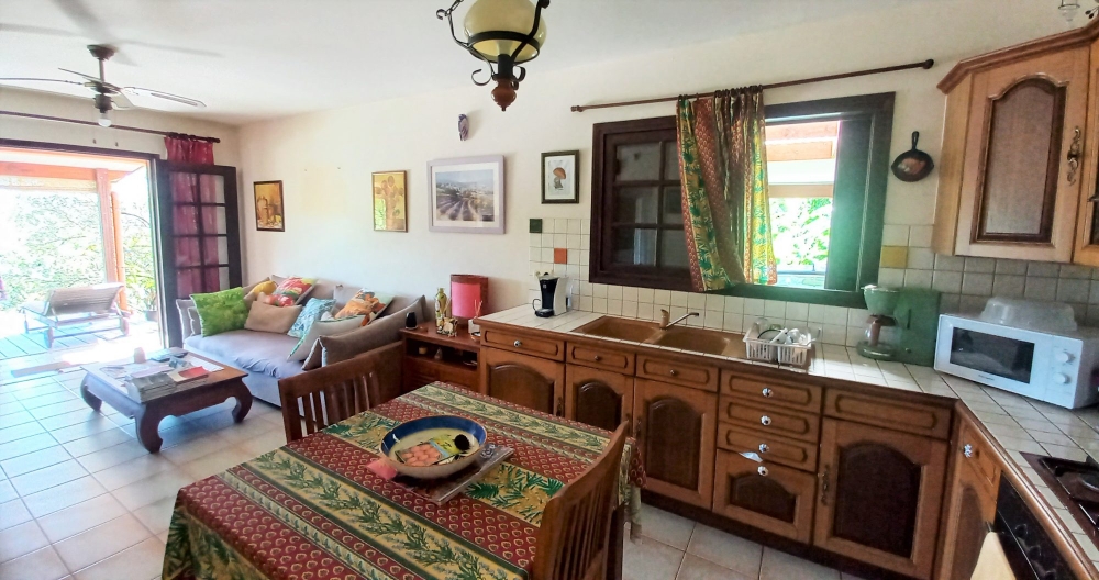 La maison est composée d'une cuisine ouverte sur un salon, de trois chambres, d'une salle d'eau et d'un WC.