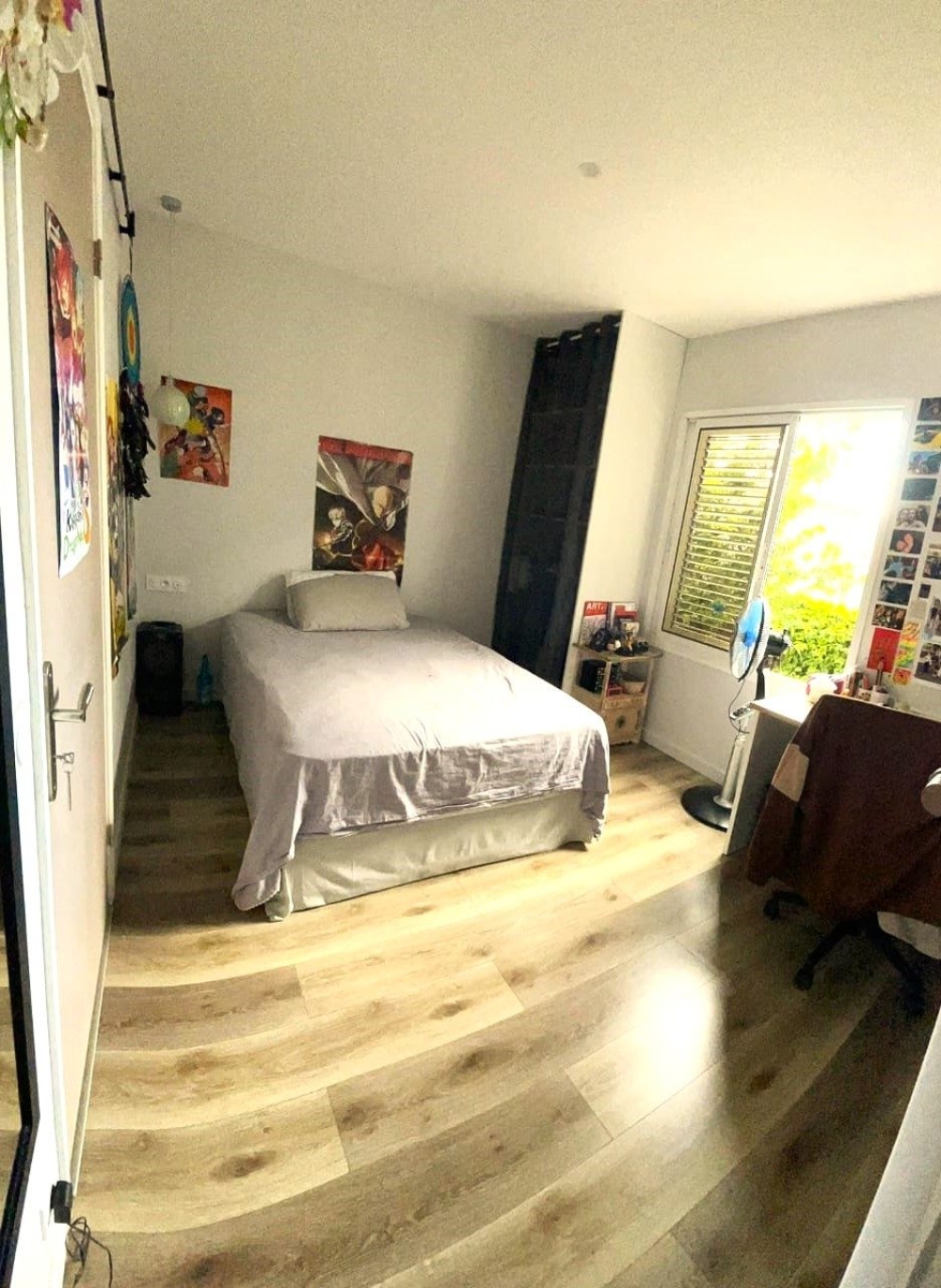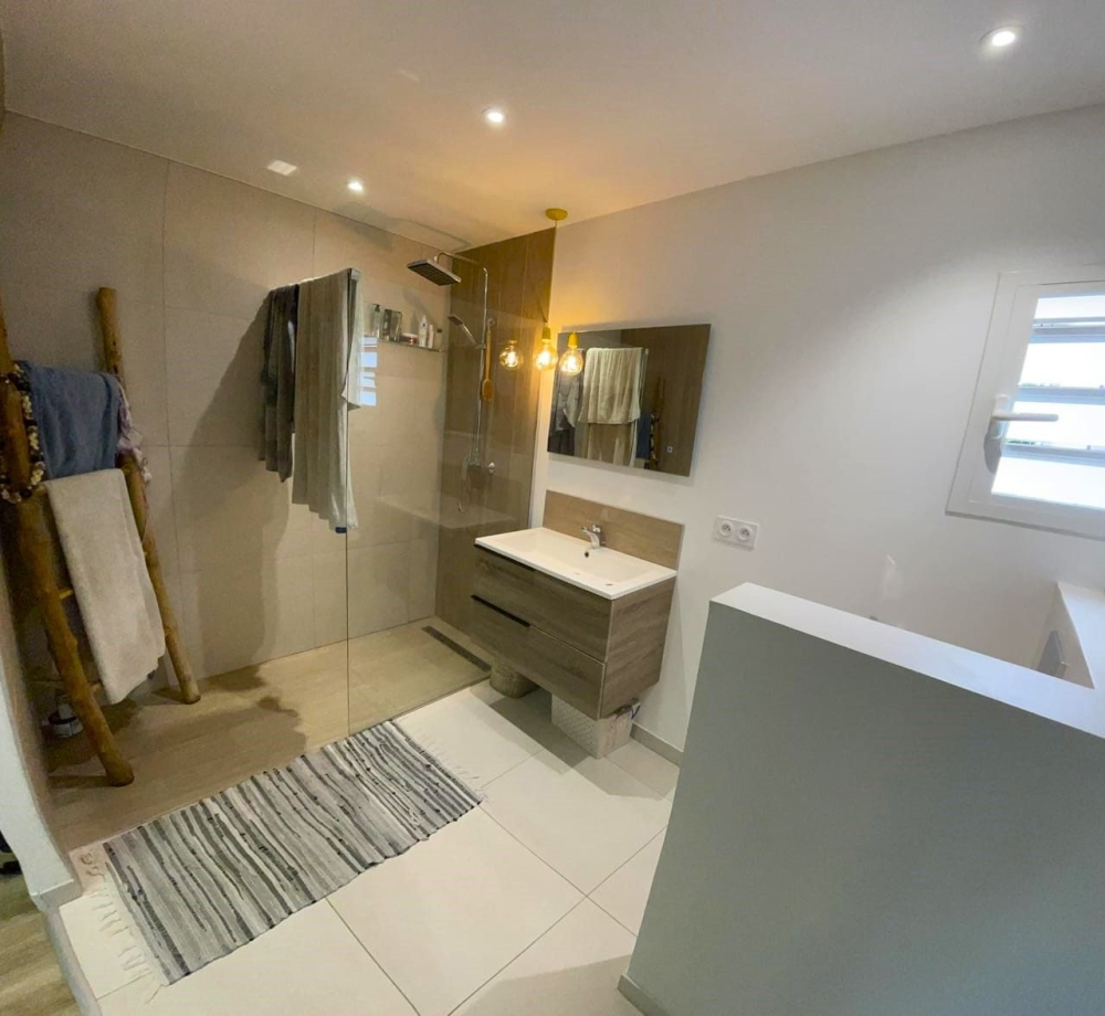 Cuisiné équipée ouverte sur séjour, suite parentale climatisée avec placards et salle d'eau, deux chambres climatisées avec placards, salle d'eau, wc.