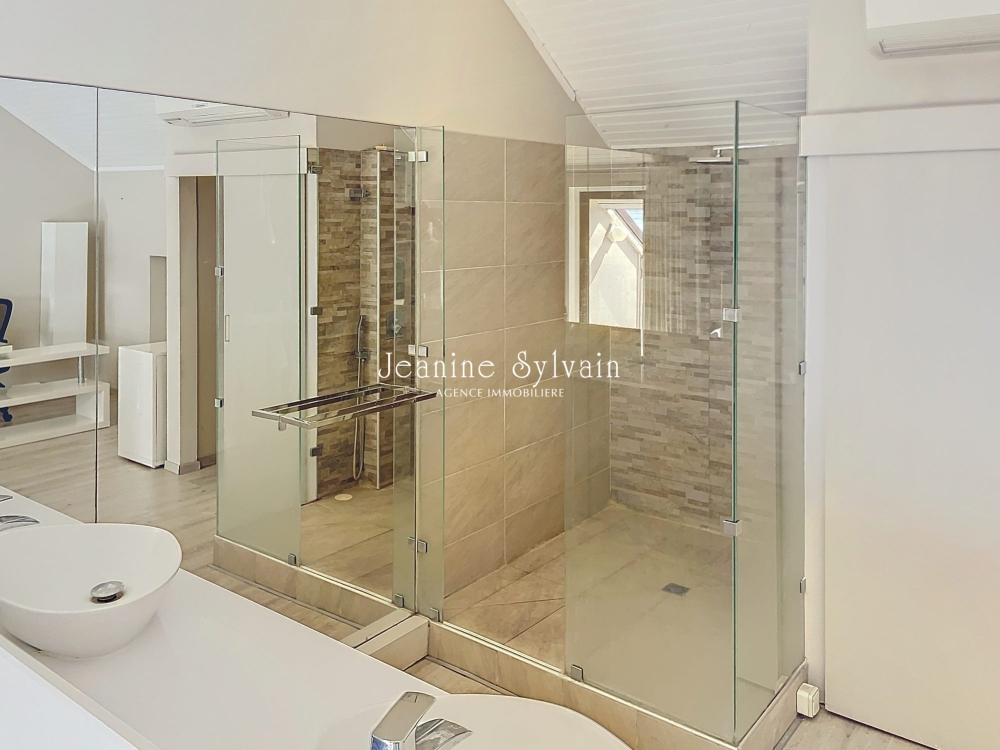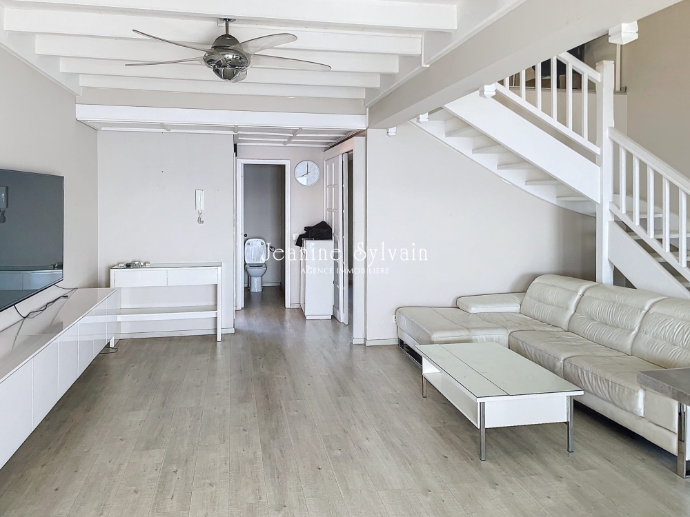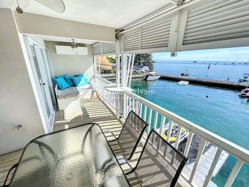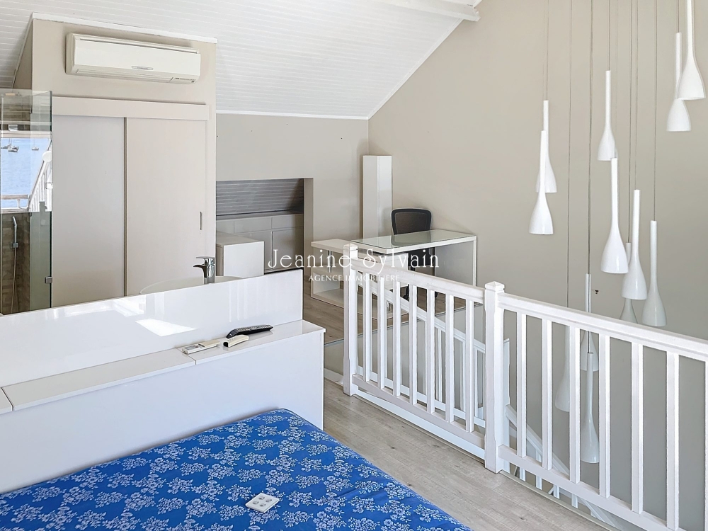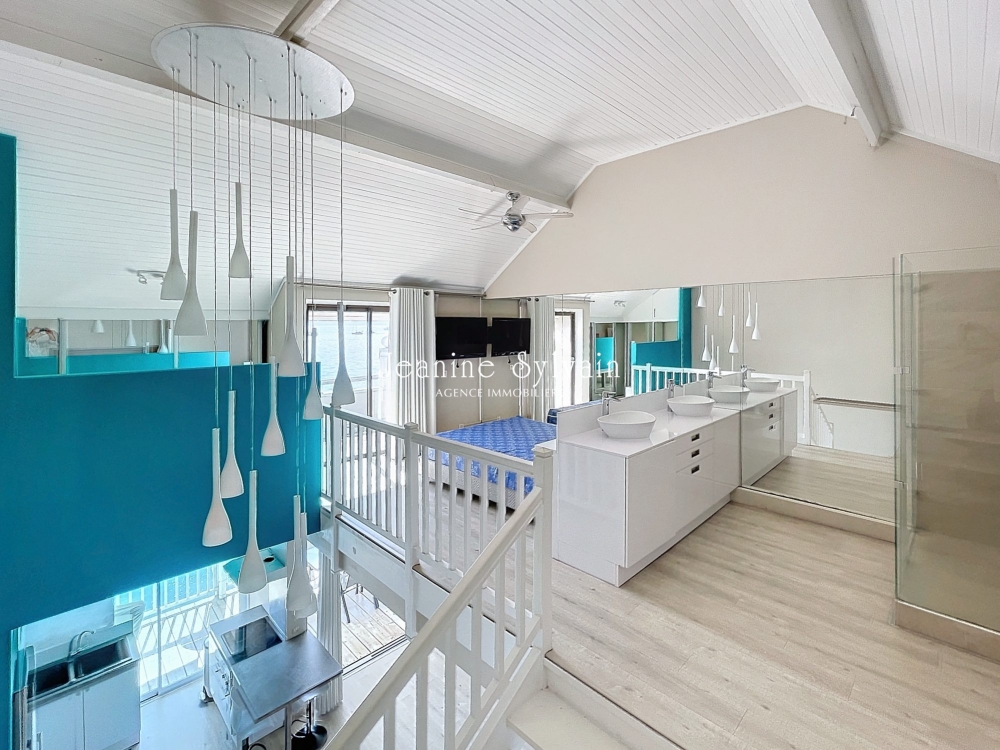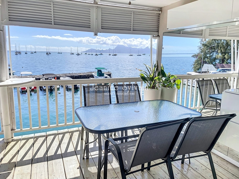 Marina Lotus, très bel F3 duplex, bien aménagé, avec terrasse couverte donnant direct sur la vue mer et Moorea, comprenant au rez de chaussé cuisine équipée moderne, séjour avec canapé et TV, chambre avec salle d'eau, WC indépendant, et à l'étage bel espace chambre salle d'eau, dressing, bureau et terrasse.