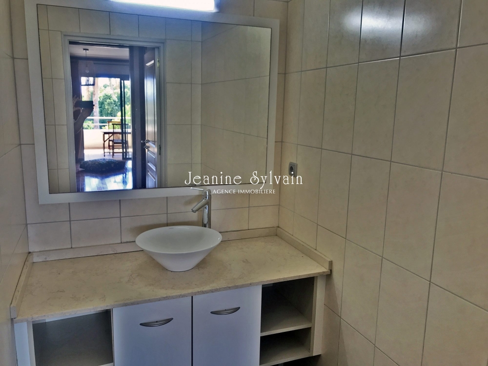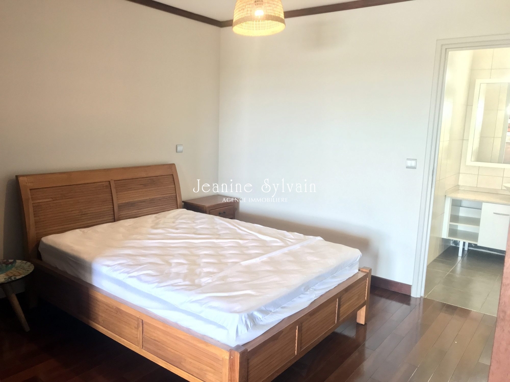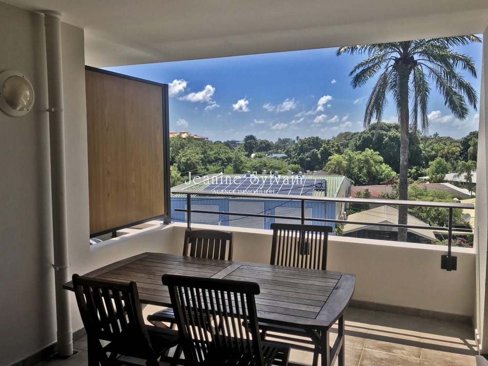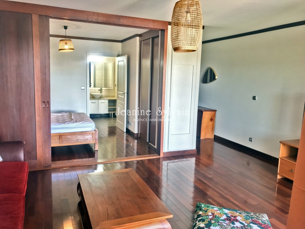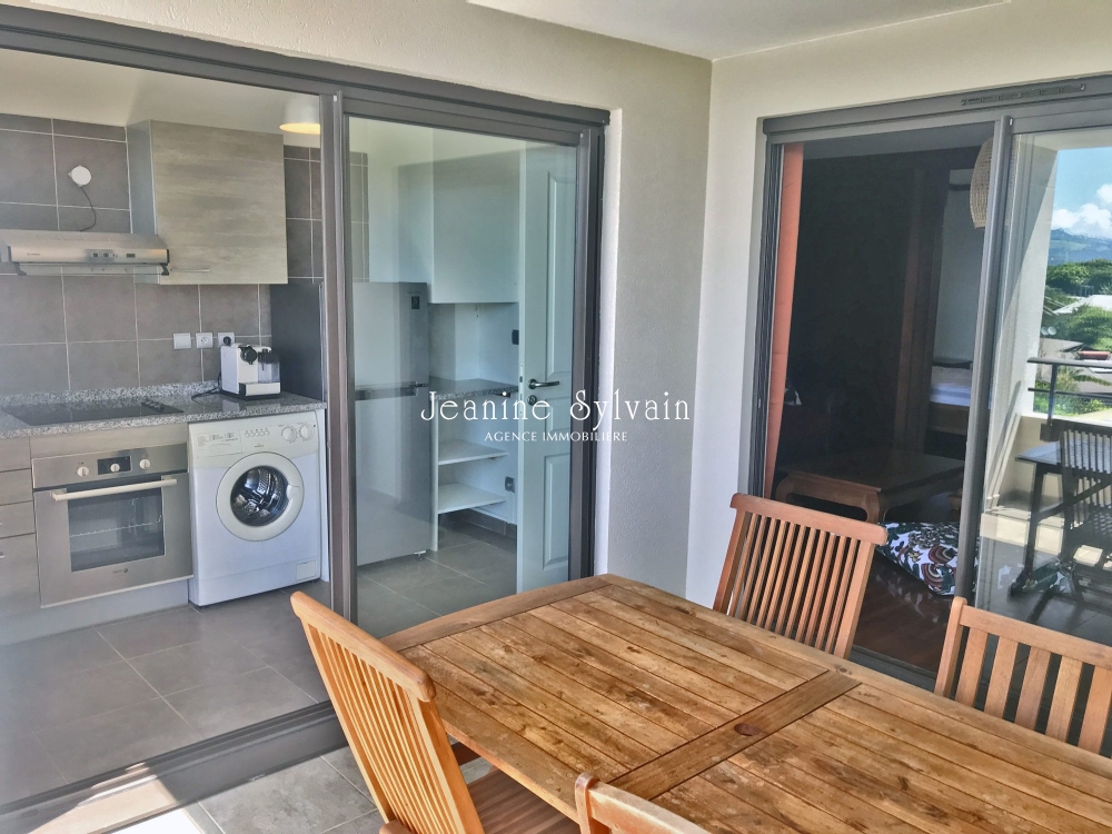 Lagon Bleu, spacieux F1 avec chambre séparée par une claustra en bois exotique du séjour, cuisine donnant sur le séjour et la terrasse couverte; calme en hauteur, entièrement meublé et équipé climatisé. Belles prestation une place de parking en sous sol. Piscine, salle de sport dans la résidence.