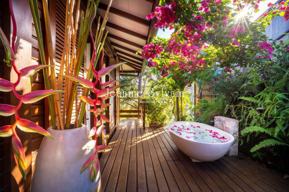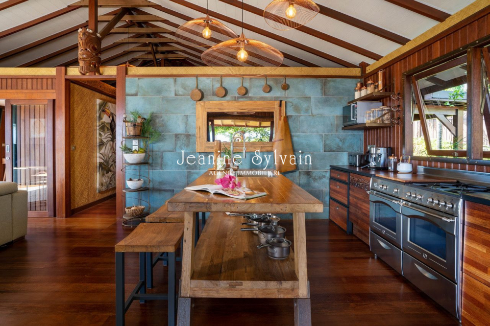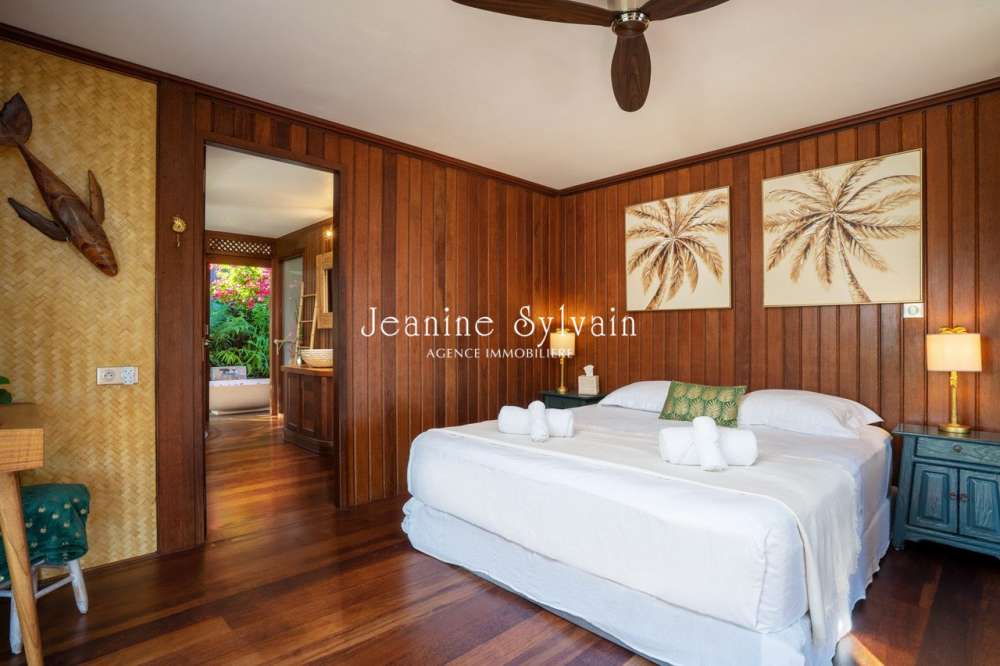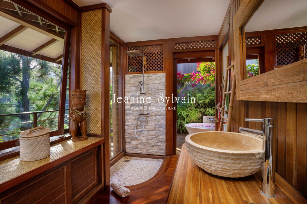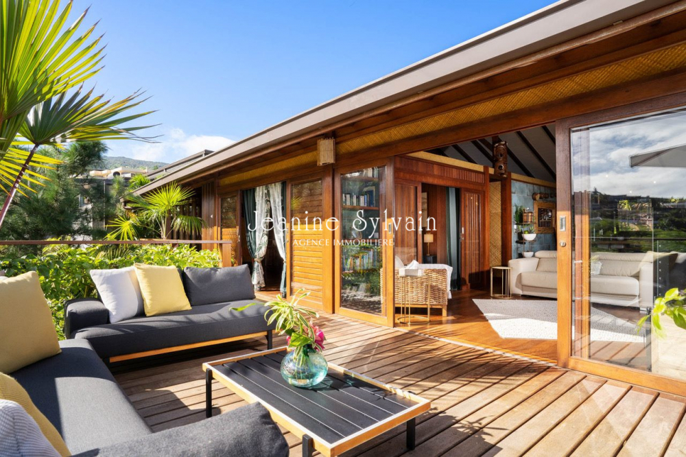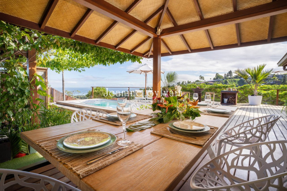 Nichée sur les hauteurs de Punaauia, cette villa Balinaise en bois exotique offre une vue panoramique sur mer et Moorea. Ses intérieurs spacieux et lumineux, baignés de lumière naturelle, créent une atmosphère chaleureuse et accueillante. Le jardin paysagé, agrémenté d'un bassin à poissons et de plantes tropicales, invite à la détente. Trois chambres, deux salles d'eau modernes, un fare pote'e traditionnel et une terrasse couverte complètent ce bien d'exception. Située dans un lotissement sécurisé, cette villa est un véritable havre de paix à quelques minutes des commodités. Le spa de nage, véritable écrin de sérénité, vous invite à vous relaxer dans une eau chaude et à profiter des bienfaits de l'hydrothérapie.