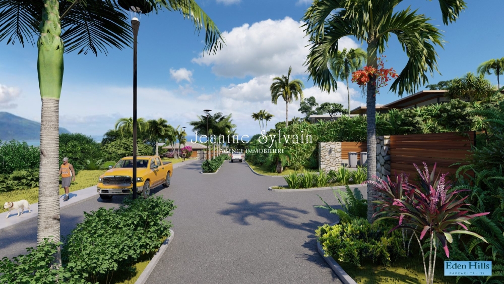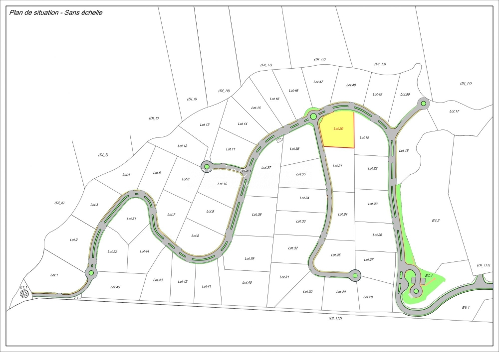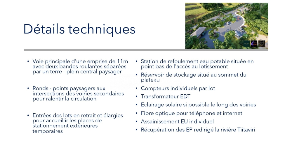 Infrastructures routières : Voie principale de 11m, ronds-points paysagers et entrées de lots spacieuses.