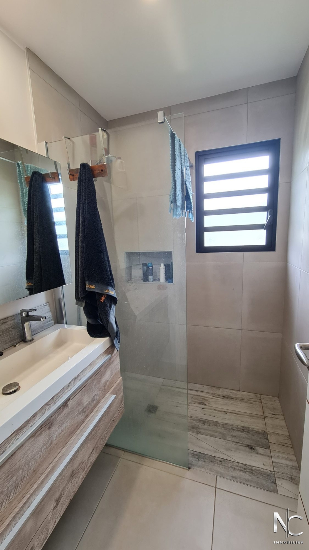 Séjour donnant sur cuisine équipée avec îlot central, 3 chambres climatisées avec placards dont une suite parentale avec dressing et sde + wc, 2ème salle d'eau, 2ème wc, buanderie.
