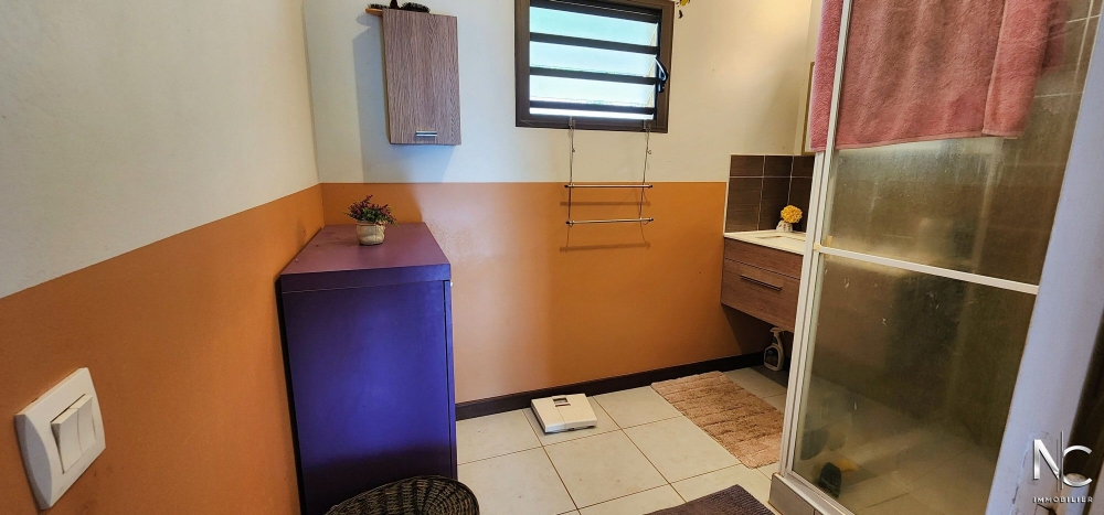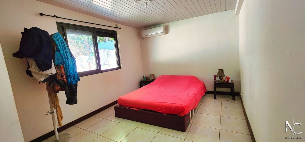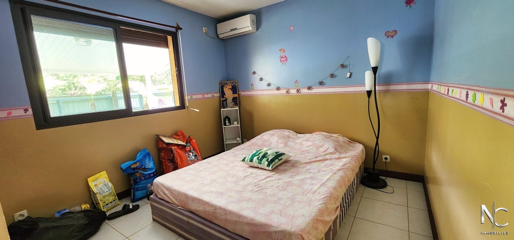 L'entrée, abritée par le carport double, est aménagée d'un grand placard buanderie et dessert la chambre parentale équipée d'un grand placard mural, d'un climatiseur et d'un volet roulant avec vue sur le jardin arrière de la parcelle.