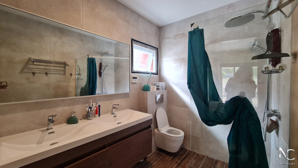 Elle se compose d'un vaste séjour/salon de 60 m² avec une cuisine entièrement équipée et une arrière-cuisine, d'un espace parentale avec suite, dressing et salle d'eau privative + wc, d'un espace enfant avec 2 chambres et une salle d'eau + un wc indépendant, et d'une chambre avec un accès sur l'extérieur pouvant servir soit de bureau soit de lieu pour exercer une activité professionnelle à domicile.