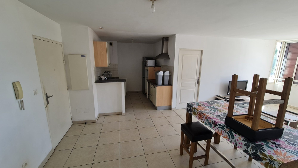 Celui-ci comprend ; une belle cuisine aménagée et équipe, ouverte et donnant sur un salon/séjour.