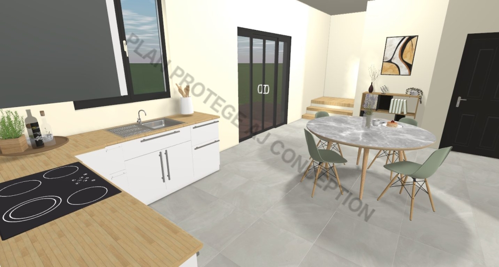 Cette villa neuve dispose au Rez-de-chaussée; d'un séjour avec cuisine ouverte de 36 m2, une suite parentale de 14,9 m2 avec une salle d'eau avec douche italienne et une vasque aménagée.