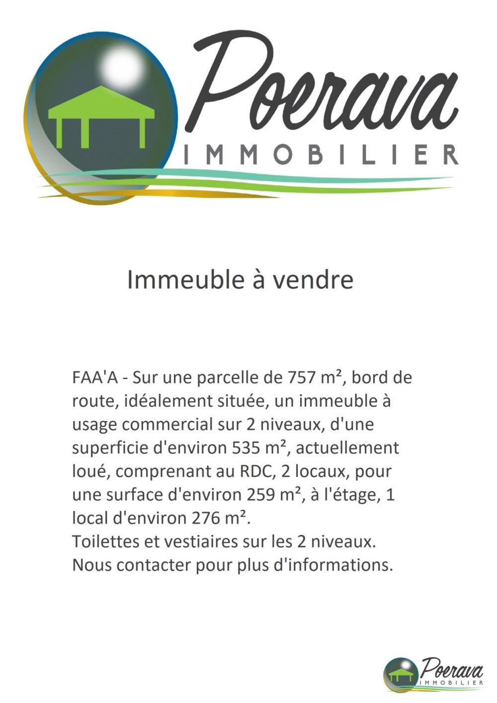 FAA'A - Sur une parcelle de 757 m², bord de route, idéalement située, un immeuble à usage commercial sur 2 niveaux, d'une superficie d'environ 535 m², actuellement loué, comprenant au RDC, 2 locaux, pour une surface d'environ 259 m², à l'étage, 1 local d'environ 276 m².
