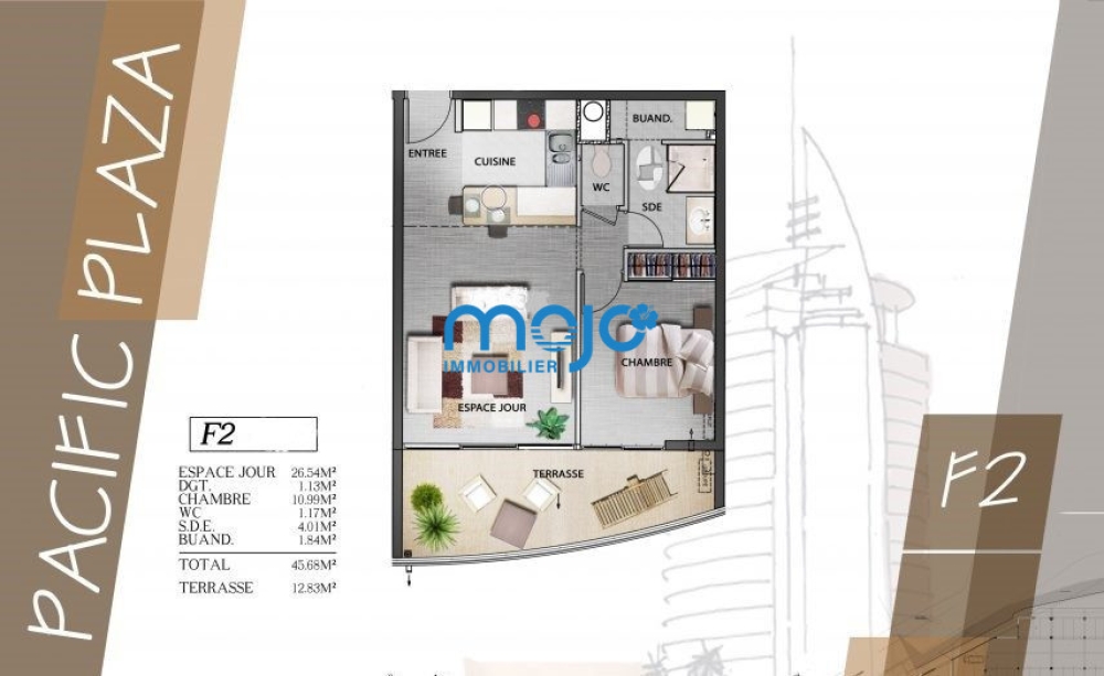Grands volumes pour ce superbe appartement de 46m² + 14 m² de terrasse couverte, au sein de la résidence de standing Pacific Plaza.