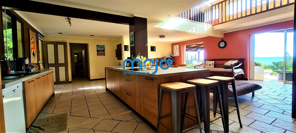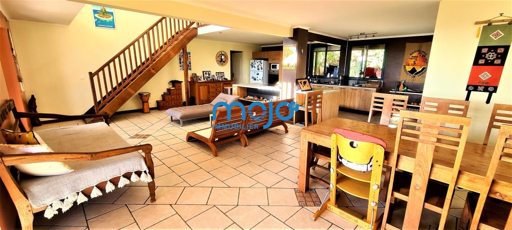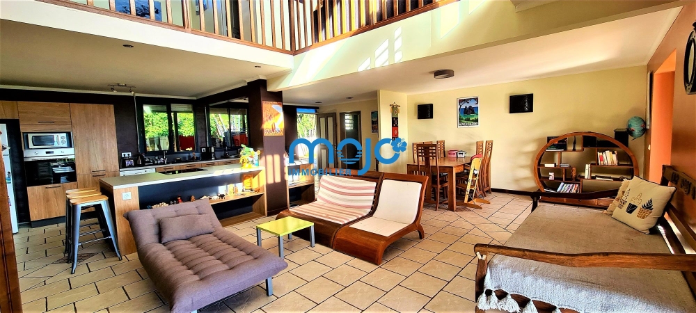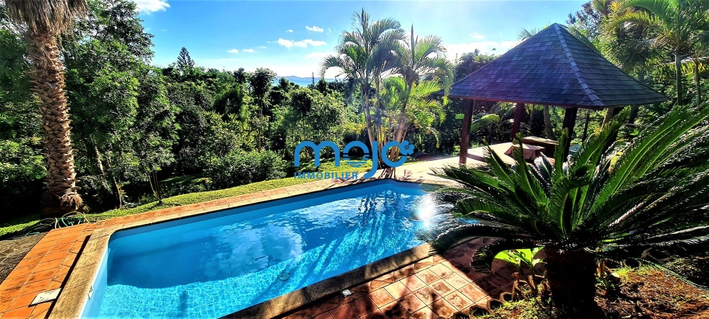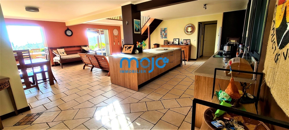 Belle villa F5 de 180m², terrasse couverte vue panoramique mer et montagne, piscine et faré. Séjour/cuisine Us 64m², 3 chambres de 12m², suite parentale 25m², 2 SDE, 2 WC, mezza.40m². Installation photovoltaïque, jardin paysagé.