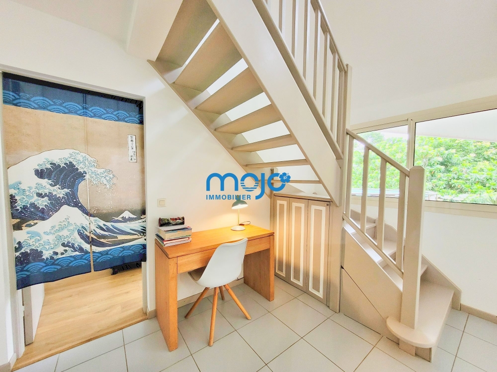 A l'étage, un espace salon, 2 chambres climatisées avec placards et une pièce supplémentaire à l'état brut à finir.