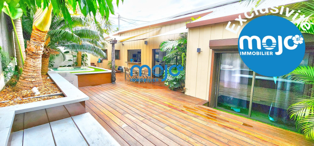 A l'extérieur, la terrasse de 30m² couverte de toiles d'ombrage est attenante à l'espace de vie et à la cuisine pour un confort optimum. Elle accueil un SPA POOL ainsi qu'un espace 'lounge' aménagé de banquettes et bordé d'une végétation luxuriante.