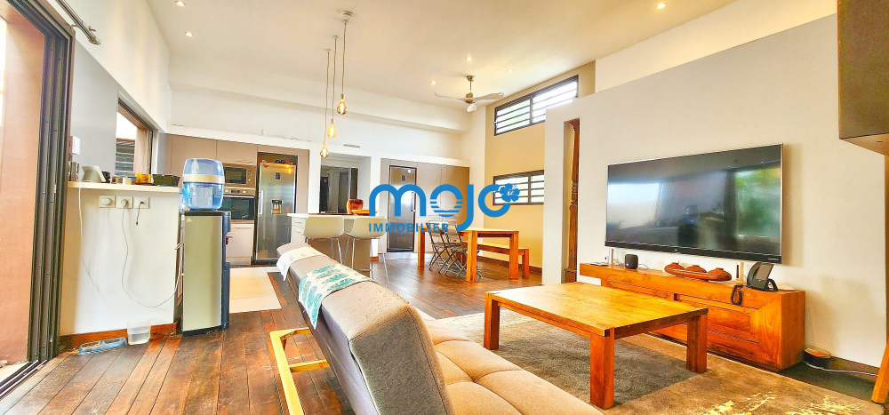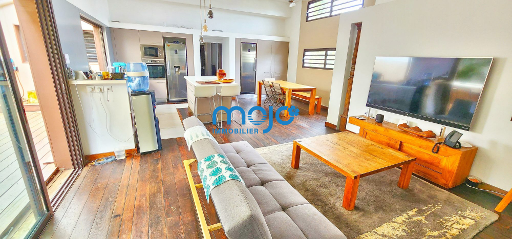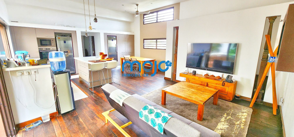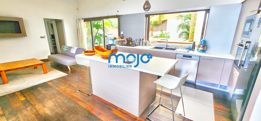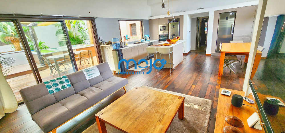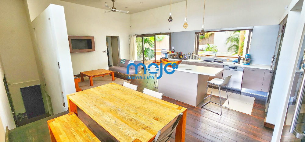 La villa F5 d'une surface habitable de 125m² dispose d'une superbe pièce de vie de 41m² ouverte sur la terrasse et offrant une belle hauteur sous plafond, un plancher en bois massif et une cuisine US entièrement équipée.