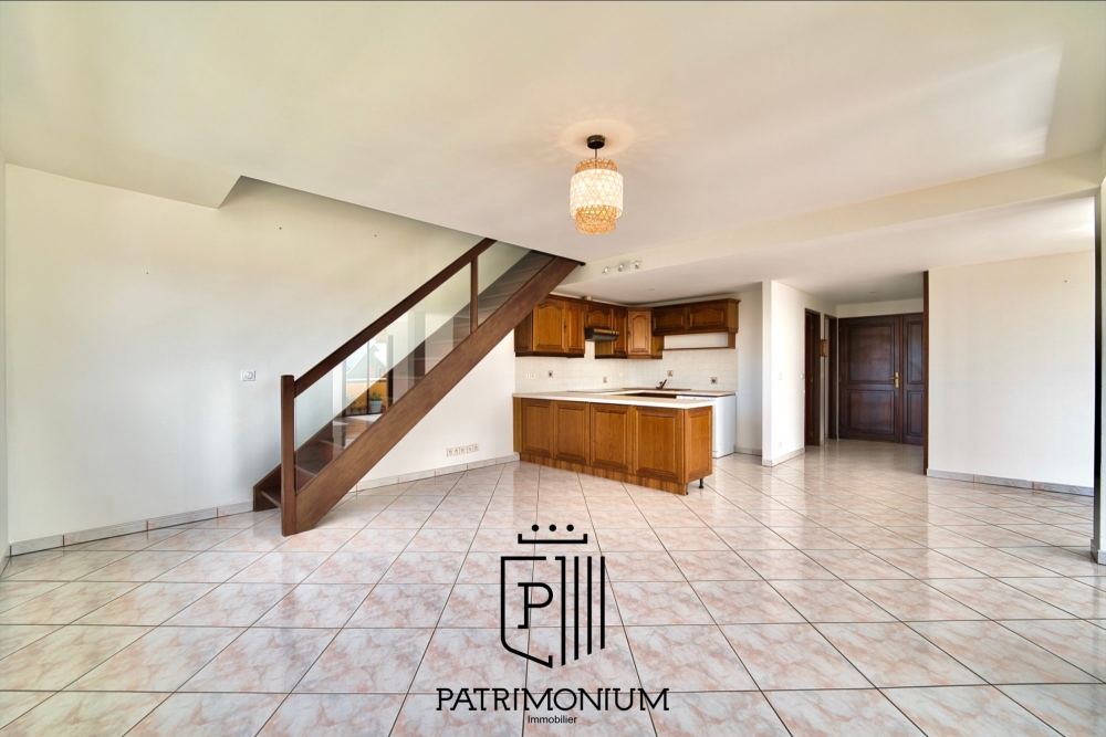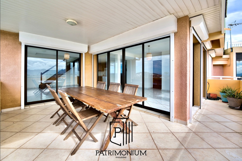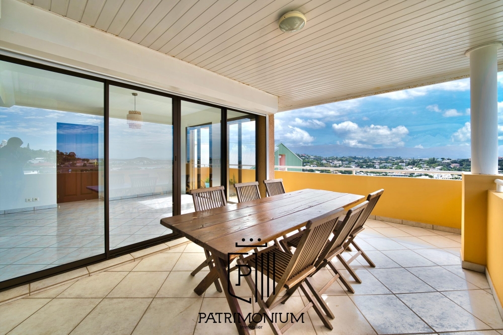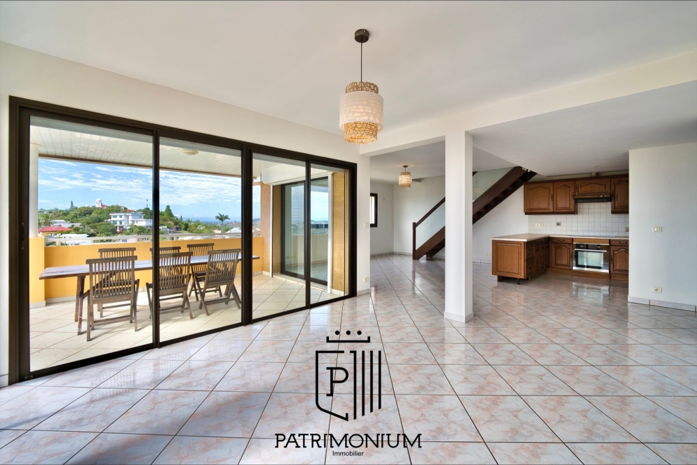 Le séjour ouvert sur la cuisine crée une ambiance conviviale, et donne accès à une spacieuse terrasse d'environ 20 m² offrant une vue panoramique imprenable sur la ville de Sainte Marie.