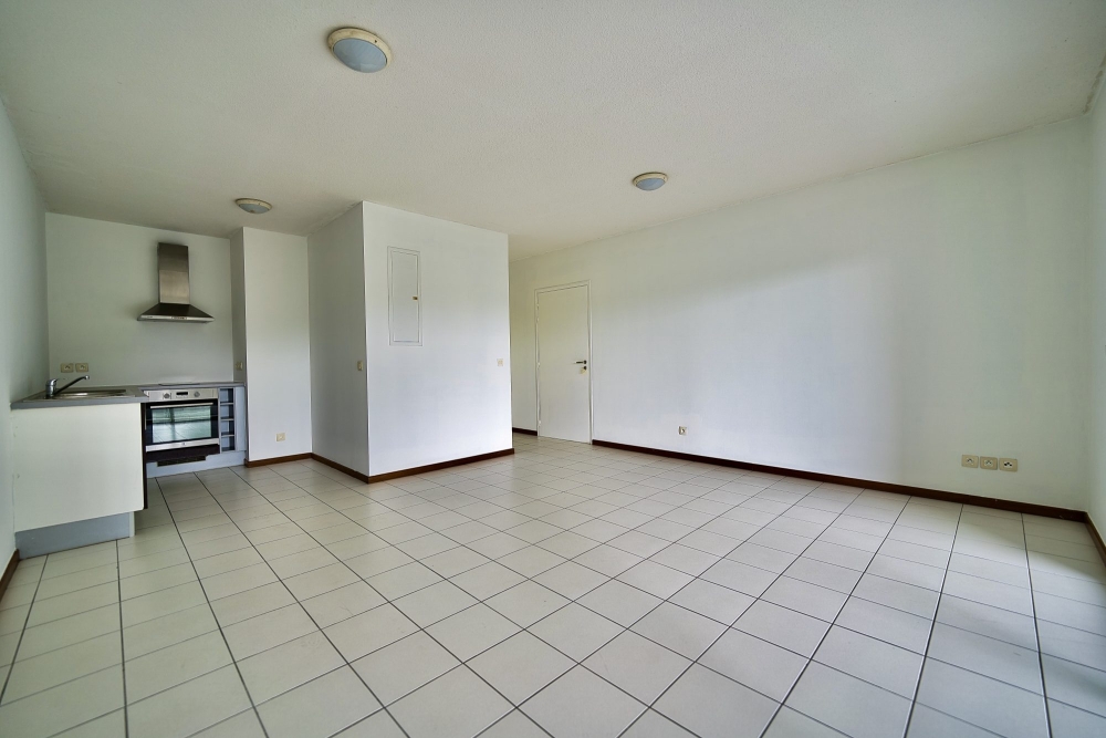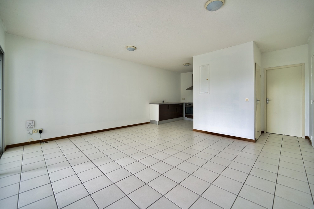 Cet appartement comprend une grande pièce de vie, une cuisine équipée et aménagée, une buanderie, une chambre climatisée avec placard, une salle d'eau avec WC, et une terrasse couverte.