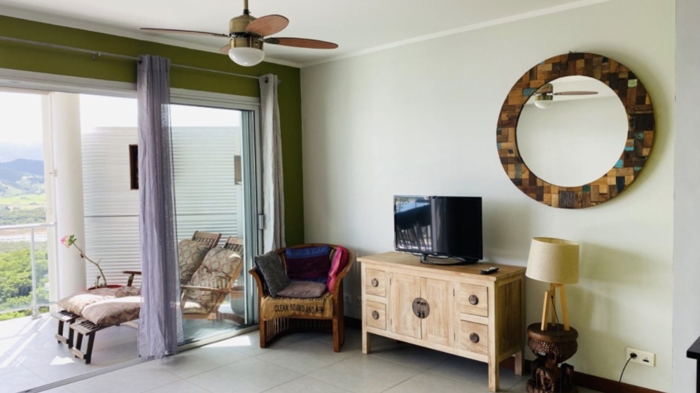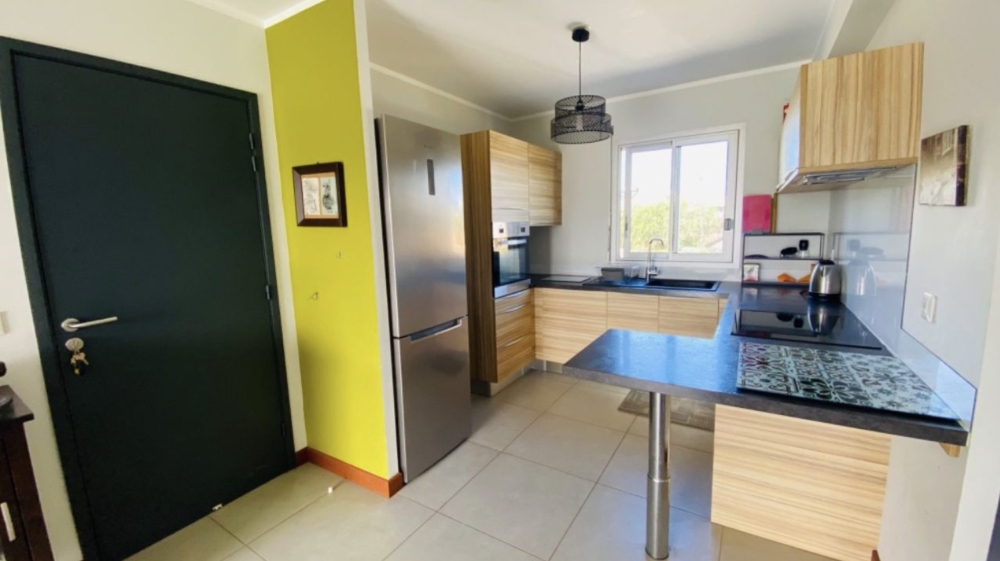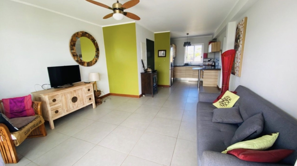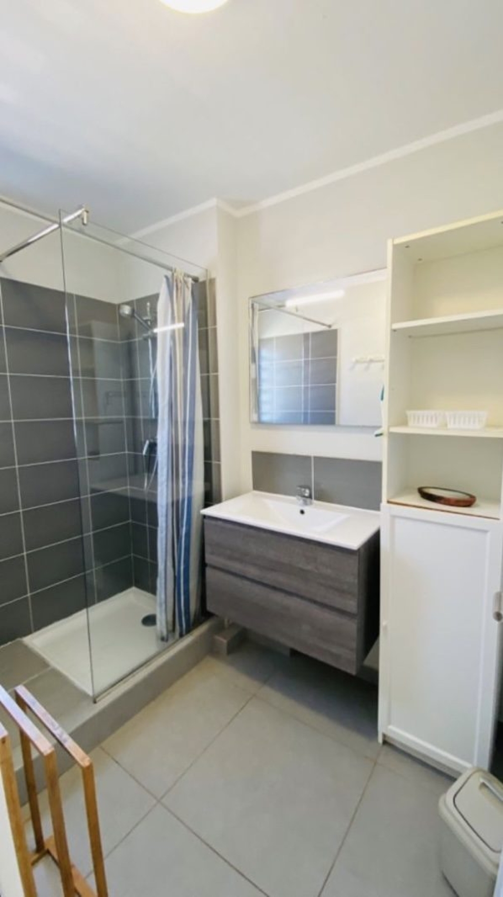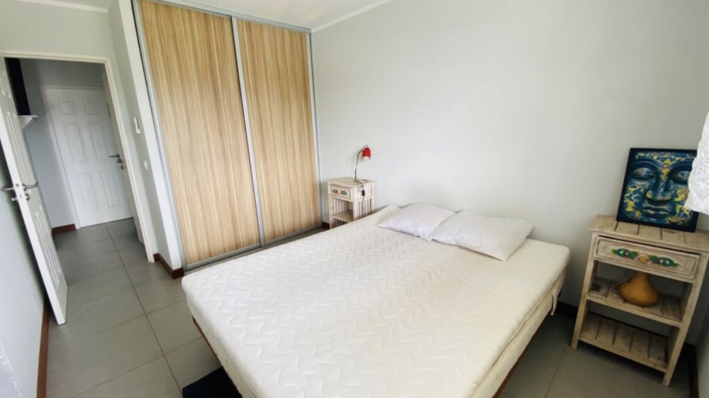 L'appartement se compose d'un beau séjour lumineux avec un volet roulant électrique, s'ouvrant sur une vaste terrasse de 15m², couverte et sans vis-à-vis. La cuisine ouverte et équipée inclut une plaque induction, un four, un micro-onde, un réfrigérateur et tous les ustensiles nécessaires. Vous trouverez également une grande chambre confortable avec volet roulant, climatiseur et placard.