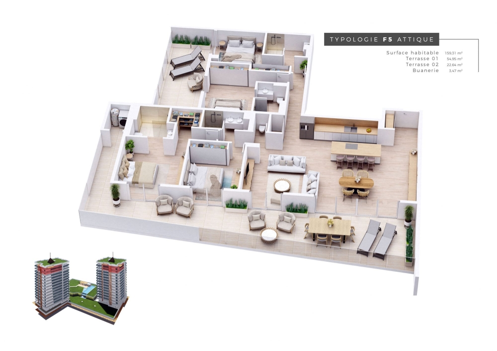 Au pied des plages, la résidence propose des appartements spacieux et modernes, allant du F2 au F5, avec de belles terrasses extérieures.