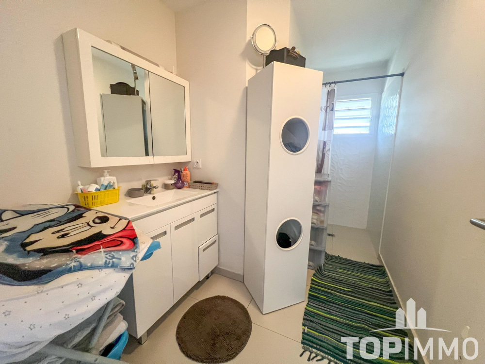La maison comprend un grand séjour lumineux avec une baie vitrée équipée de volets roulants électriques, donnant sur une terrasse couverte de 20m² avec coin buanderie. La cuisine est aménagée et équipée (four intégré, plaque au gaz, hotte, emplacement pour lave-vaisselle, et double évier).