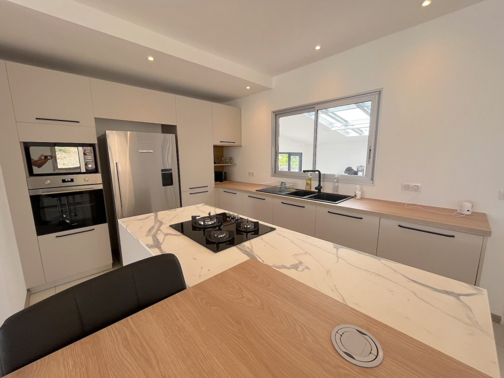 La Villa comprend : Un vaste séjour avec une superbe cuisine équipée et aménagée (Le séjour donne sur la terrasse en deck bénéficiant d'une superbe vue dégagée sur la mer), 3 chambres avec placard, ventilateur et climatisation, 1 salle d'eau + WC, 1 chambre parentale avec salle d'eau + WC séparé et dressing. Pour finir, une grande buanderie.