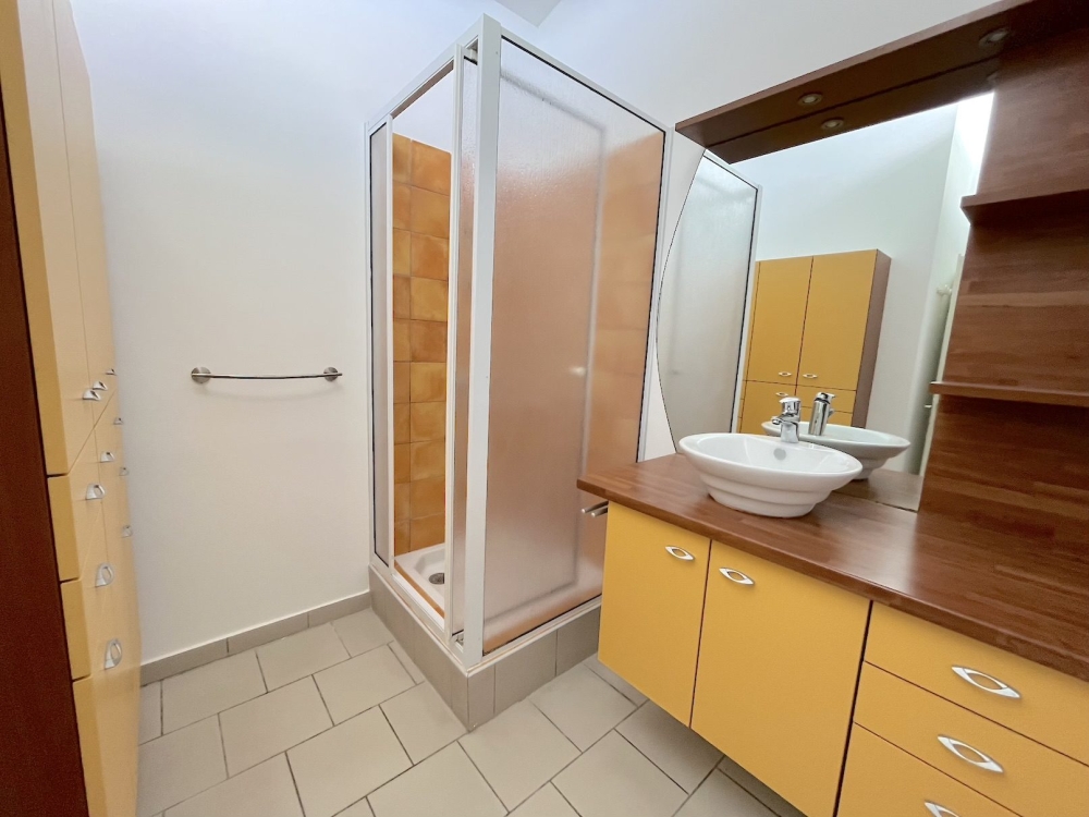 L'appartement de 83m² + 16m² de terrasse couverte + 9m² d'espace extérieur (buanderie) comprend : Un grand séjour avec cuisine équipée et aménagée (four et lave vaisselle encastrés, plaque et hotte), 2 grandes chambres climatisées avec placard, une salle d'eau avec placard et un WC séparé avec lave main.