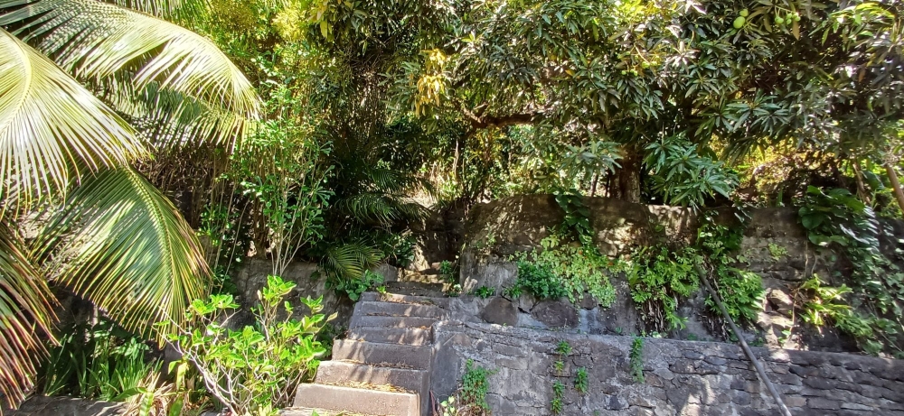 Et la partie montagne de 340m² de plateau est accessible par des escaliers en béton avec un enrochement béton/roche, dans une végétation verdoyante avec différents arbres fruitiers, invitant à la promenade et à la plénitude devant la vue Mer.