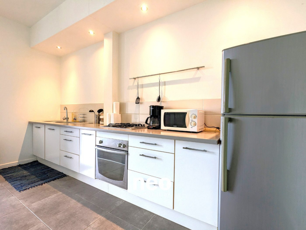 Cet appartement offre un espace de vie qui se compose d'une cuisine et salle à manger, d'un coin buanderie, d'un séjour, d'une salle d'eau avec WC, d'une mezzanine pour la partie nuit et d'un balcon.