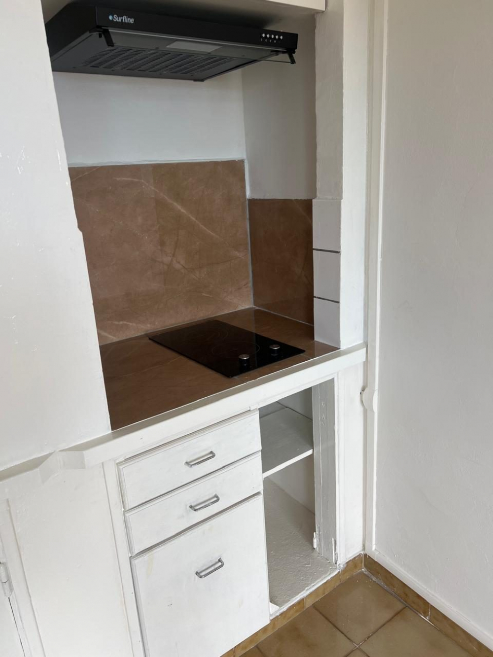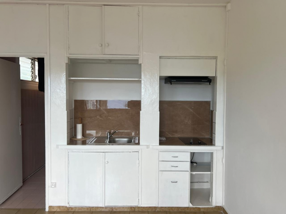 Le logement est composé d'une pièce principale avec un coin cuisine aménagée de meubles hauts et bas, et équipée d'une plaque de cuisson vitro céramique et une hotte aspirante.