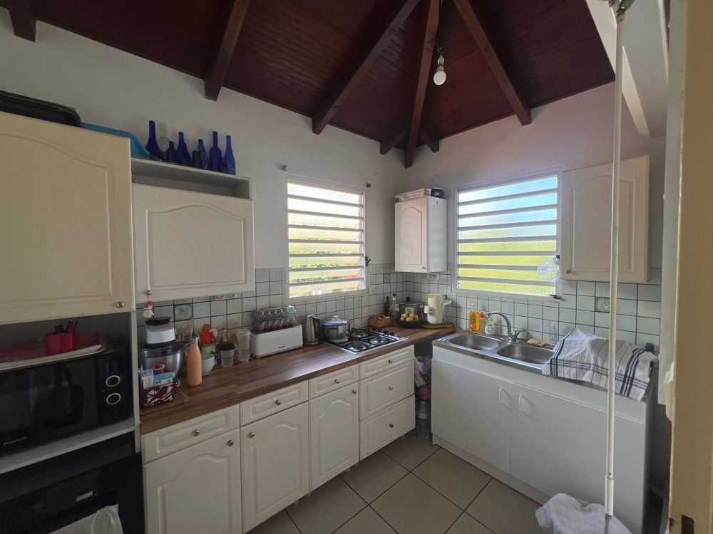 La cuisine est aménagée, et un passe plat permet de communiquer avec la terrasse ombragée mais aussi 1 à 2 place de stationnement.