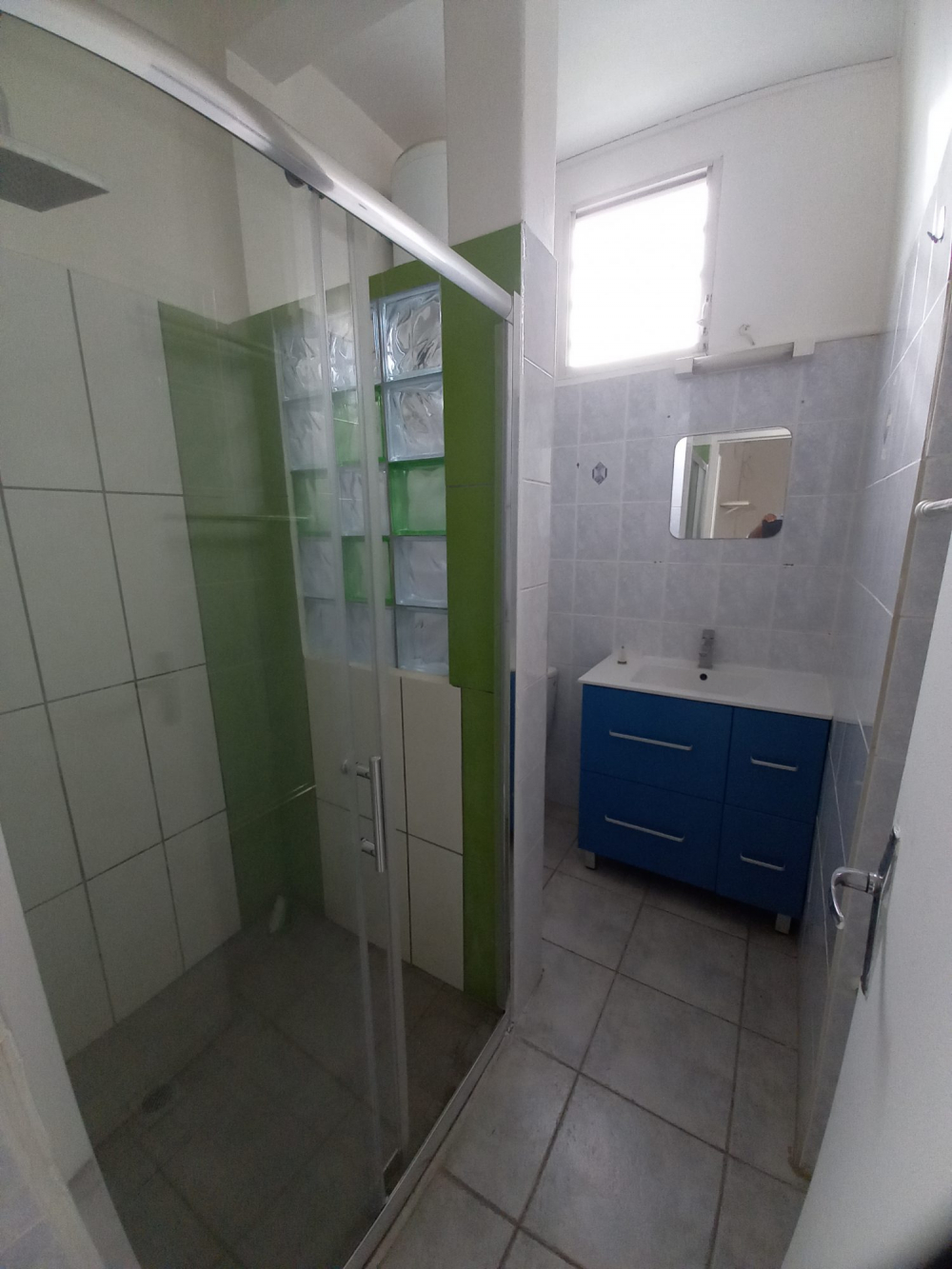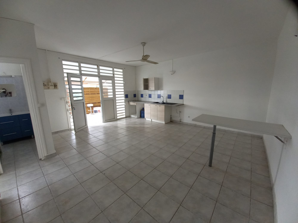 Petit appartement de type F2 dans un immeuble à deux niveau situé en bas de villa comprenant une cuisine aménagée avec plaque de cuisson, une salle d'eau, une chambre climatisée et une terrasse