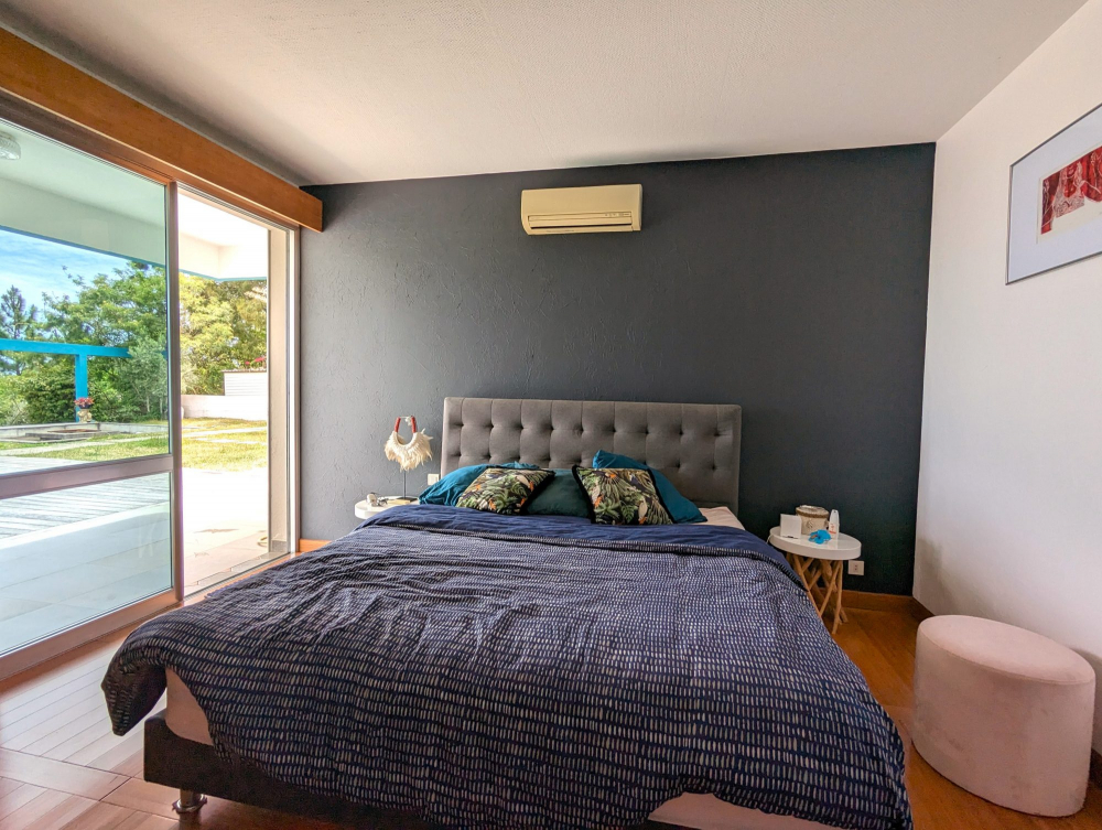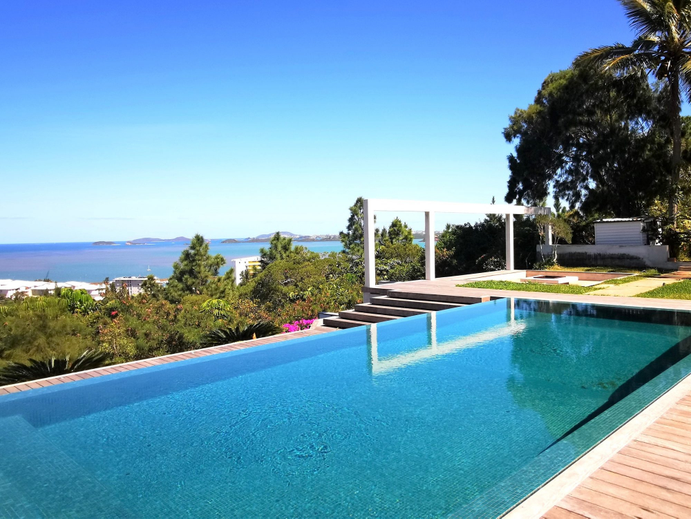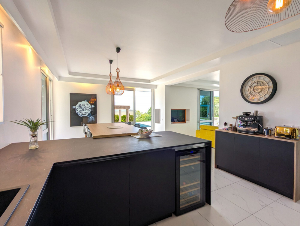 En situation dominante, au calme et avec une vue panoramique mer et montagne, villa d'architecte en maçonnerie d'environ 250m², composée d'une cuisine équipée, un séjour ouvert sur la terrasse et sur un patio intérieur, une suite parentale avec dressing et salle d'eau, 3 chambres avec placards, une seconde salle d'eau, une salle de réception avec seconde cuisine, une buanderie, un espace bureau ou réserve et un spacieux garage double ; En extérieure vous pourrez profitez d'un magnifique Pool House avec coin détente et repas et pour finir une piscine miroir avec jacuzzi et vue imprenable sur le lagon. Le tout bâti sur 18 ares de terrain très joliment arboré.