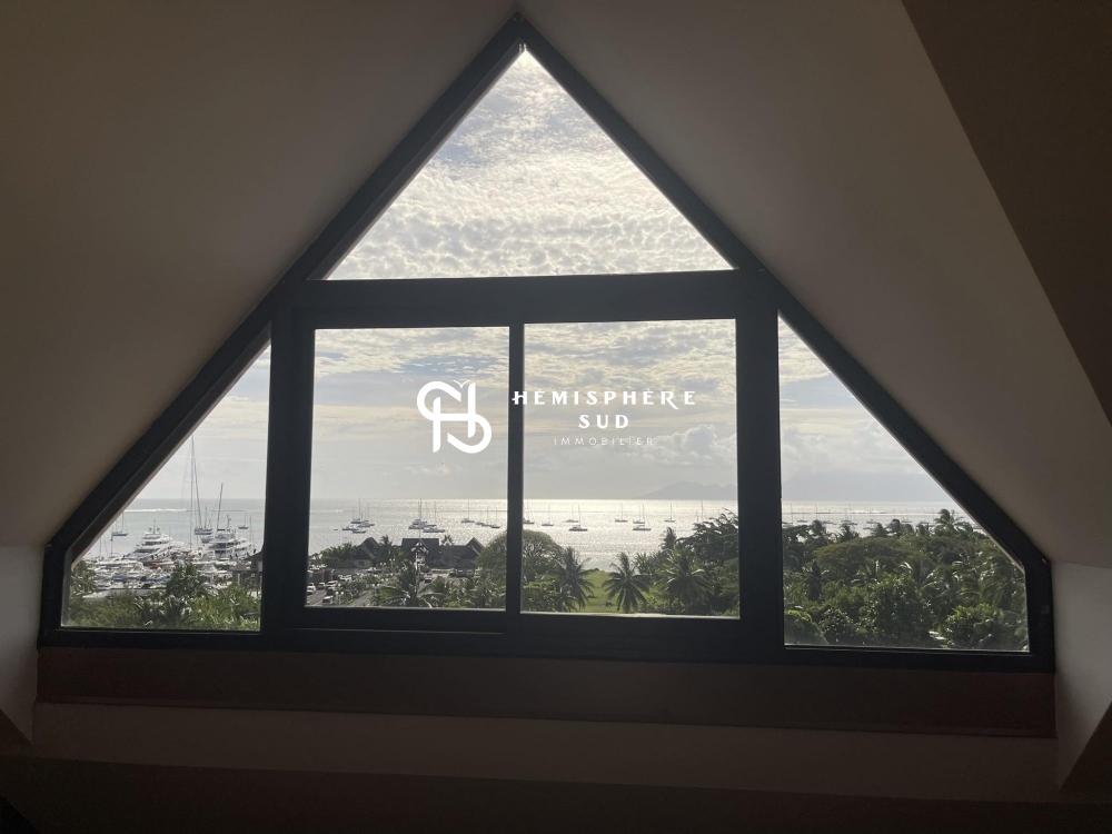 Une grande chambre parentale avec une belle fenêtre triangulaire offrant une vue sur Moorea,