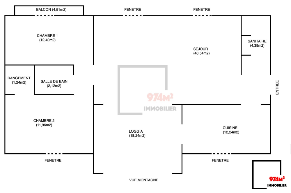 Une entrée, un grand séjour lumineux donnant sur grande varangue vue montagne, une cuisine aménagée-équipée et séparée, deux chambres dont un avec un placard et l'autre avec un balcon , une salle de bain et WC séparée.